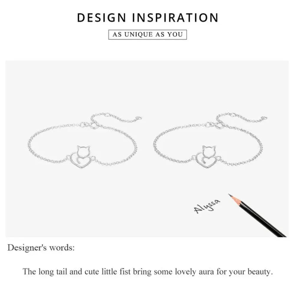Delicate chain bracelet in 925 sterling silver featuring cat and heart links with zircon accents. Adjustable length drapes lightly across the wrist.