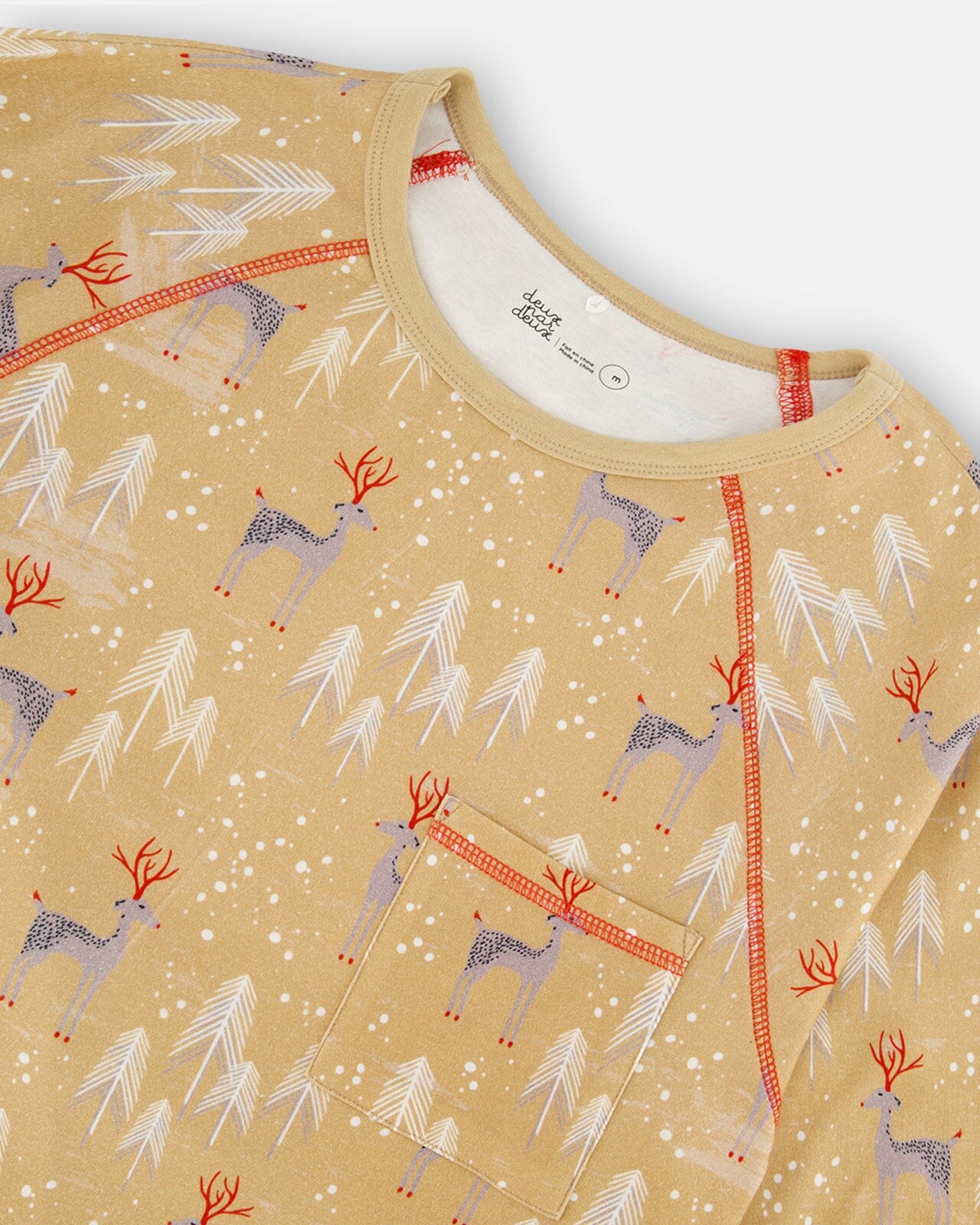 With our Adult Men Two Piece Family Christmas Pajama Set, dads and big brothers can dress to match every baby, kid, and girl in the family! Soft and cozy in organic cotton, this pajama set features a long raglan sleeve top, a comfy elastic waist pant, and a wintry reindeer and tree print with pop color red stitching.