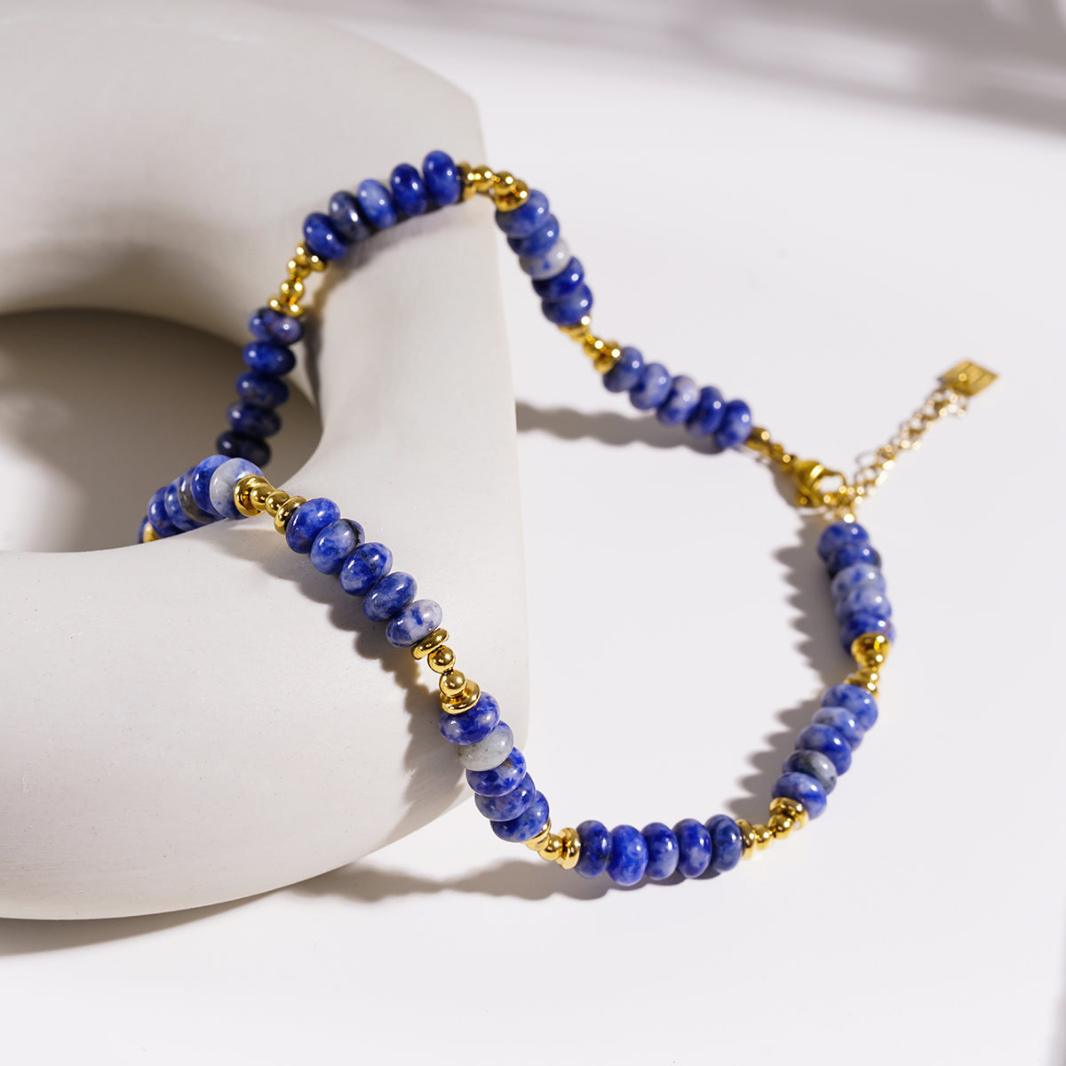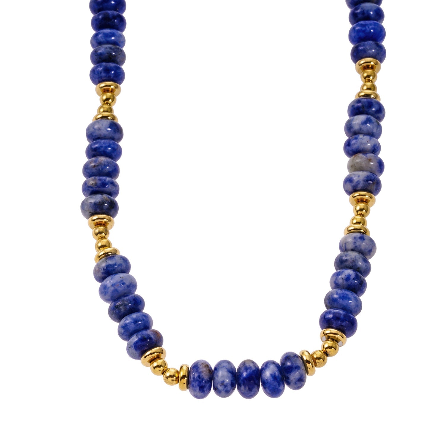 Opulent blue Sodalite stones are complemented by delicately grouped gold beads, adding a touch of boho refinement to the design, offering a seamless blend of modernity and timeless sophistication. Whether worn as a statement piece or layered with other favorites, this necklace effortlessly transitions from casual chic to formal elegance, enhancing any ensemble with it's captivating allure.