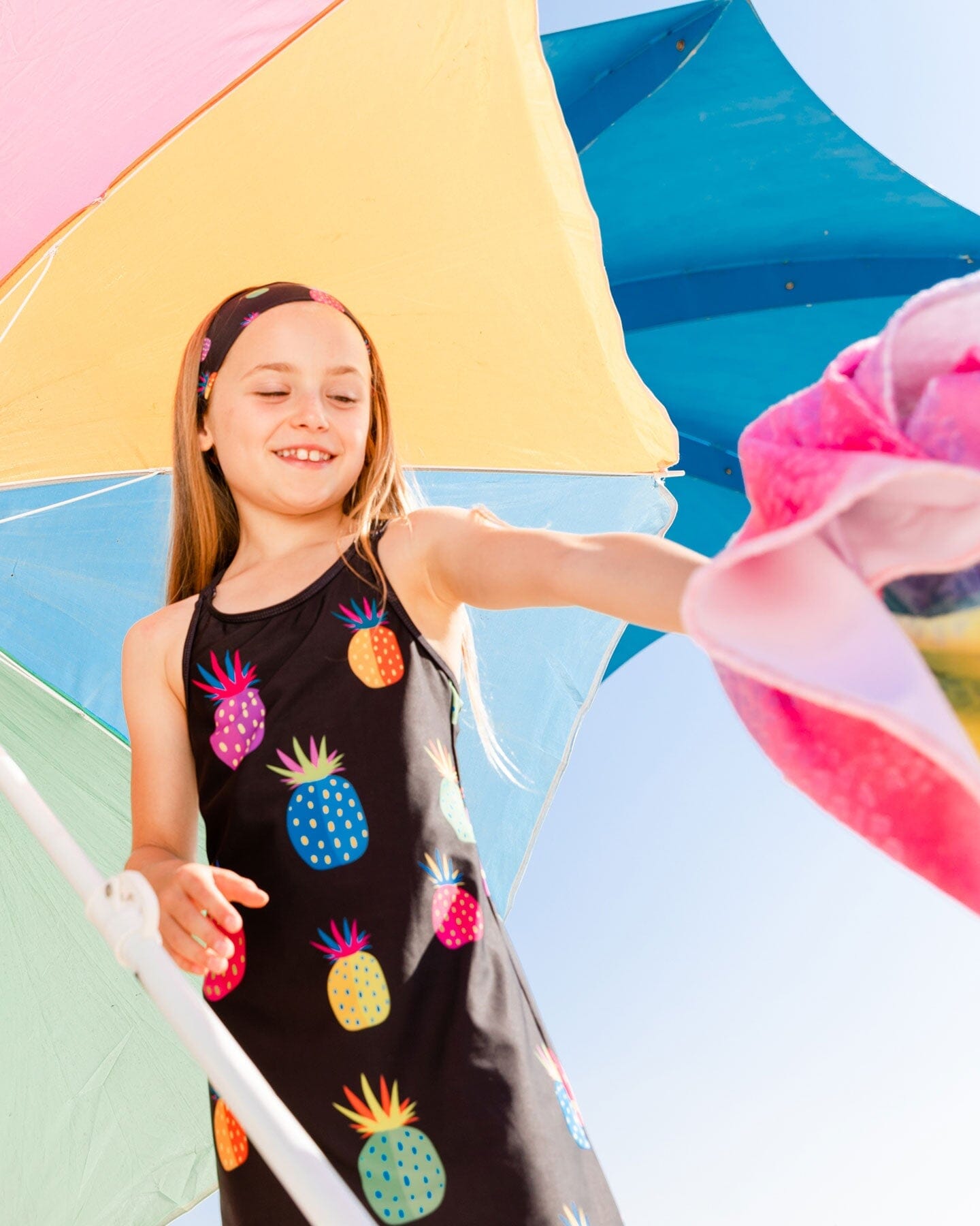 Our Beach Dress Black Printed Pineapples is the perfect coverup for a trip to and from the beach. Made from recycled stretch poly fabric, this slip-on beach dress features wide straps, a scoop neckline, and a loose silhouette. The straps meet in the back to create a cool cut out effect!