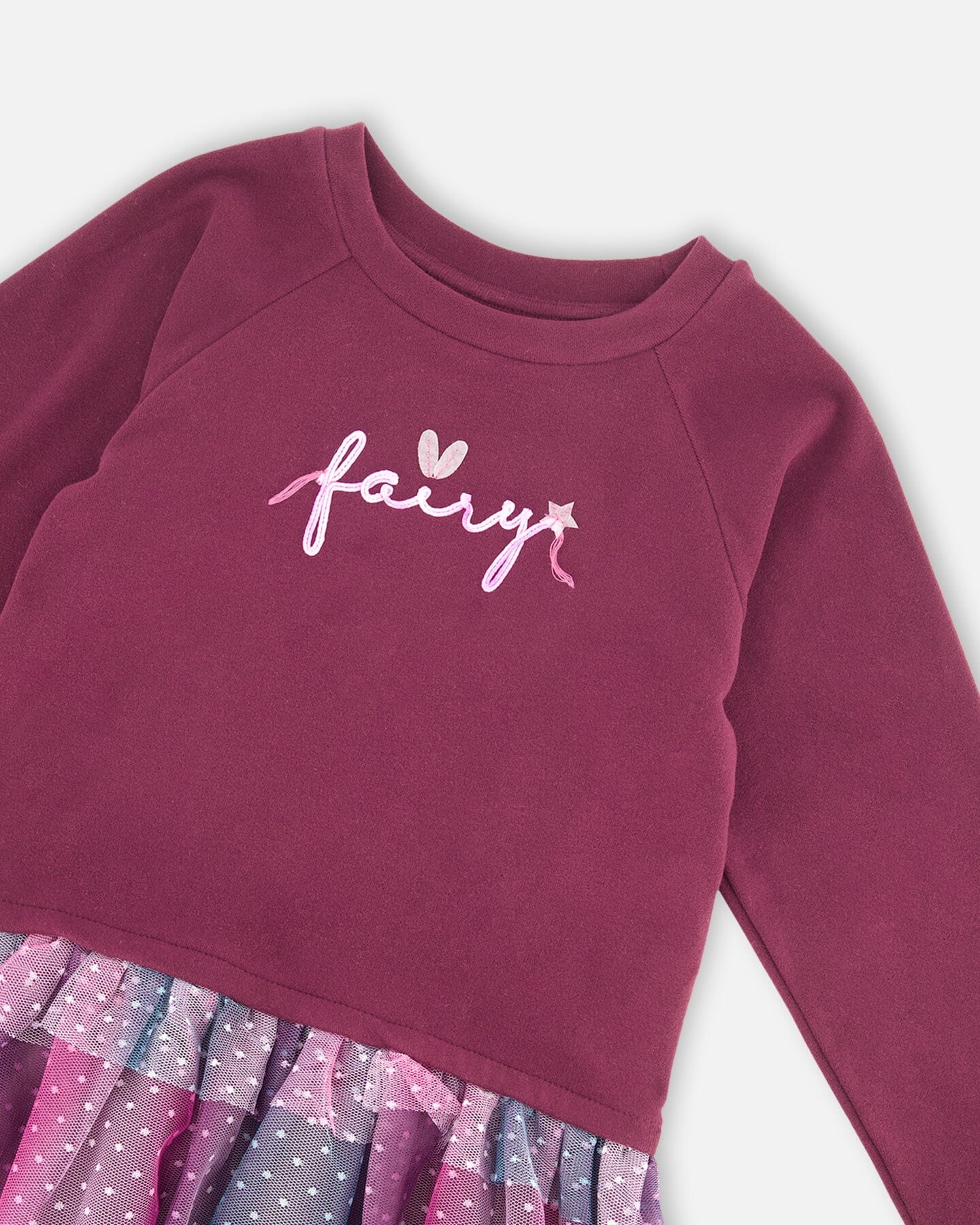 Our Bi-Material Dress with Tulle Skirt Burgundy is a statement-maker that she'll want to wear every chance she gets! The knit bodice features long sleeves, a round neckline, and an adorable fairy graphic on the chest. The colorful tulle skirt features a fun, flared shape with vertical multicolor stripes, a mini dot pattern, and a ruffles around the waist. It's a perfect choice for the girl that always wants to stand out!