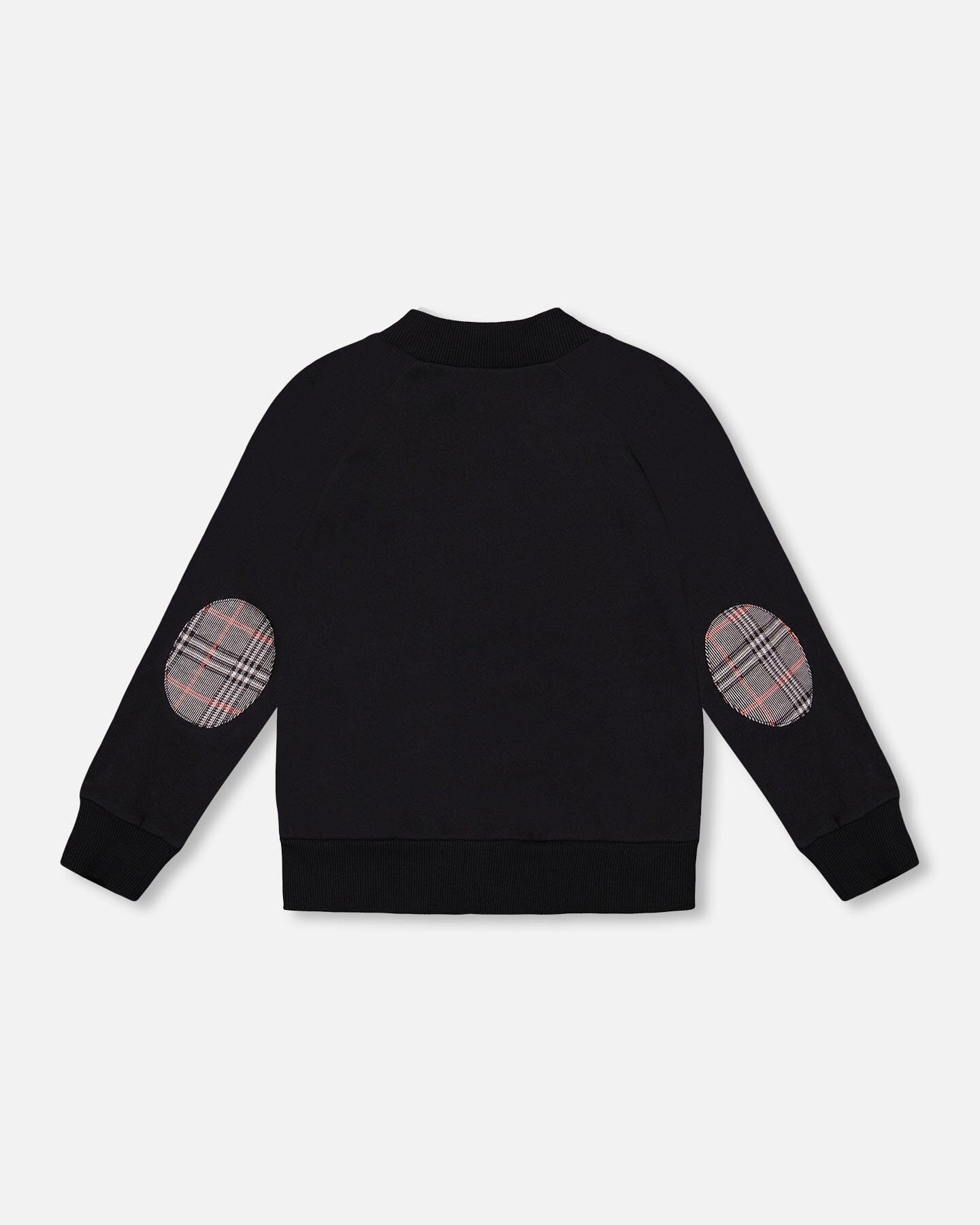 Our Plaid and Fleece Zip Front Jacket Gray And Black combines the classic charm of plaid with the cozy comfort of fleece. This bomber-style jacket features plaid front and back panels, solid black raglan sleeves with matching plaid elbow patches, and black ribbed trim at the collar, cuffs, and hem. Finished with a front zipper and welt pockets, it’s the perfect extra layer for school or play.