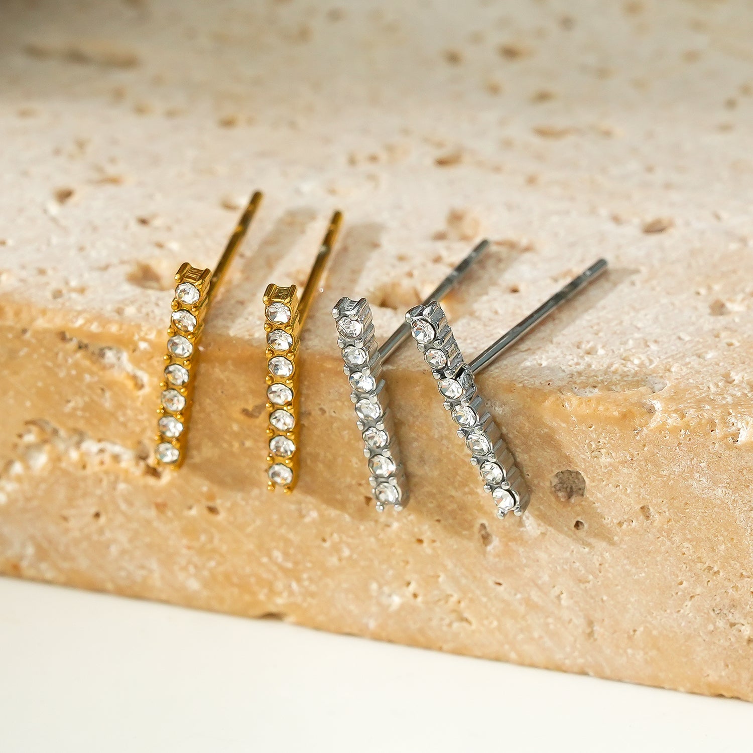 BIHAR: Minimalist Pavé Zirconia Embedded Bar Stud Earrings in White Gold (Silver Toned)