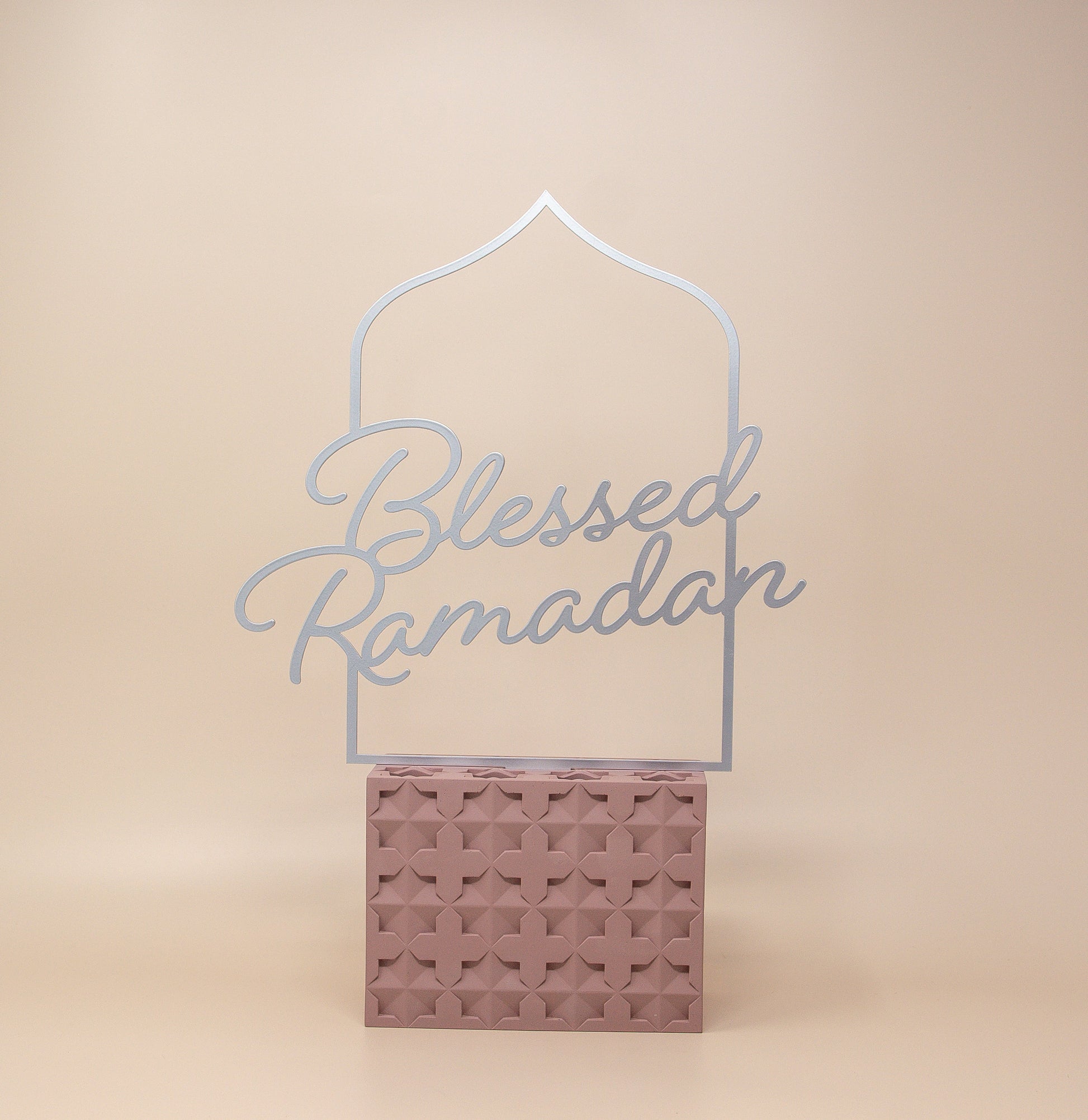 The "Blessed Ramadan" calligraphy sign centrepiece & table decor is a beautiful and intricate decorative piece designed specifically for the festive occasions of Ramadan and Eid. Made with high-quality metal, this centrepiece exudes elegance and adds a touch of luxury to any home decor.