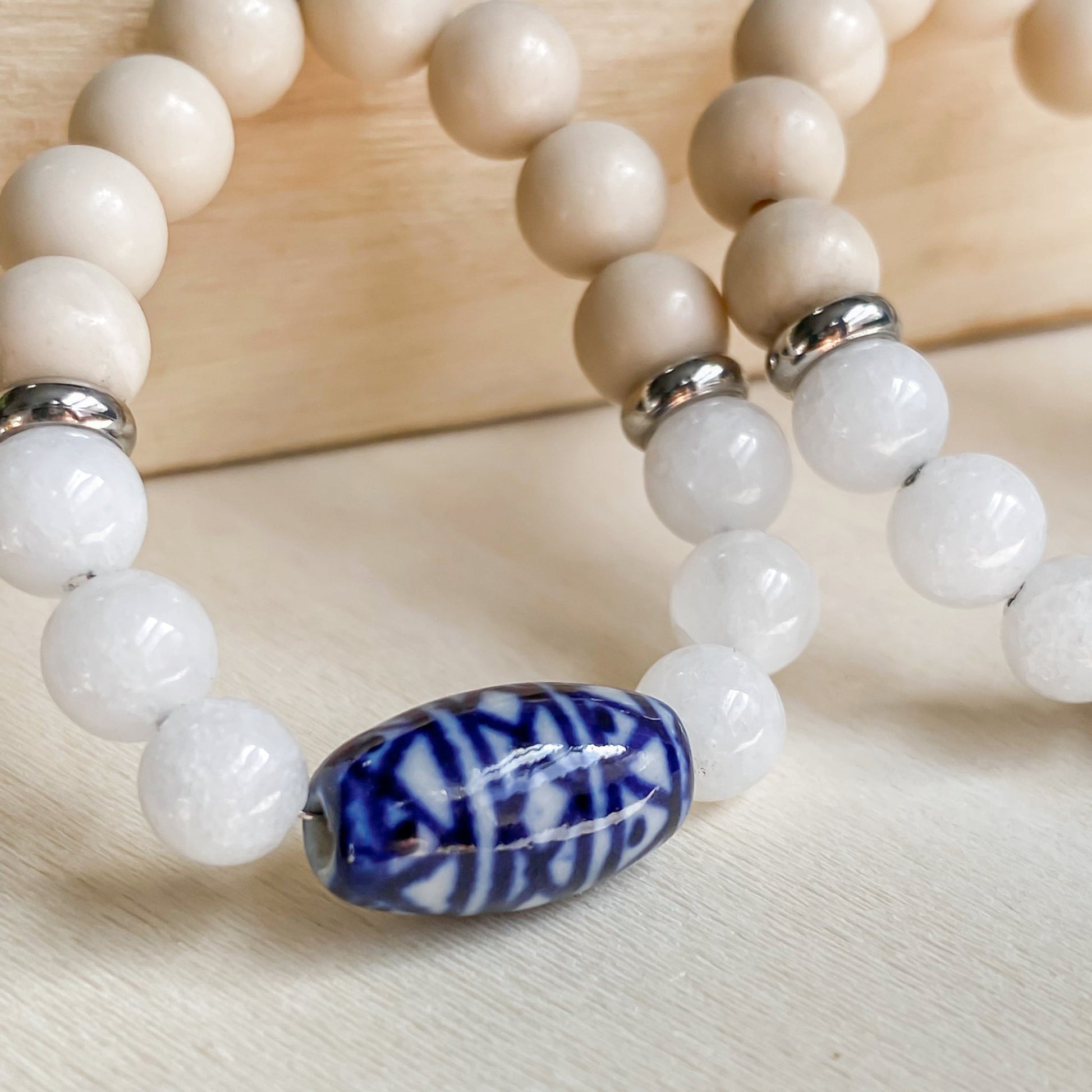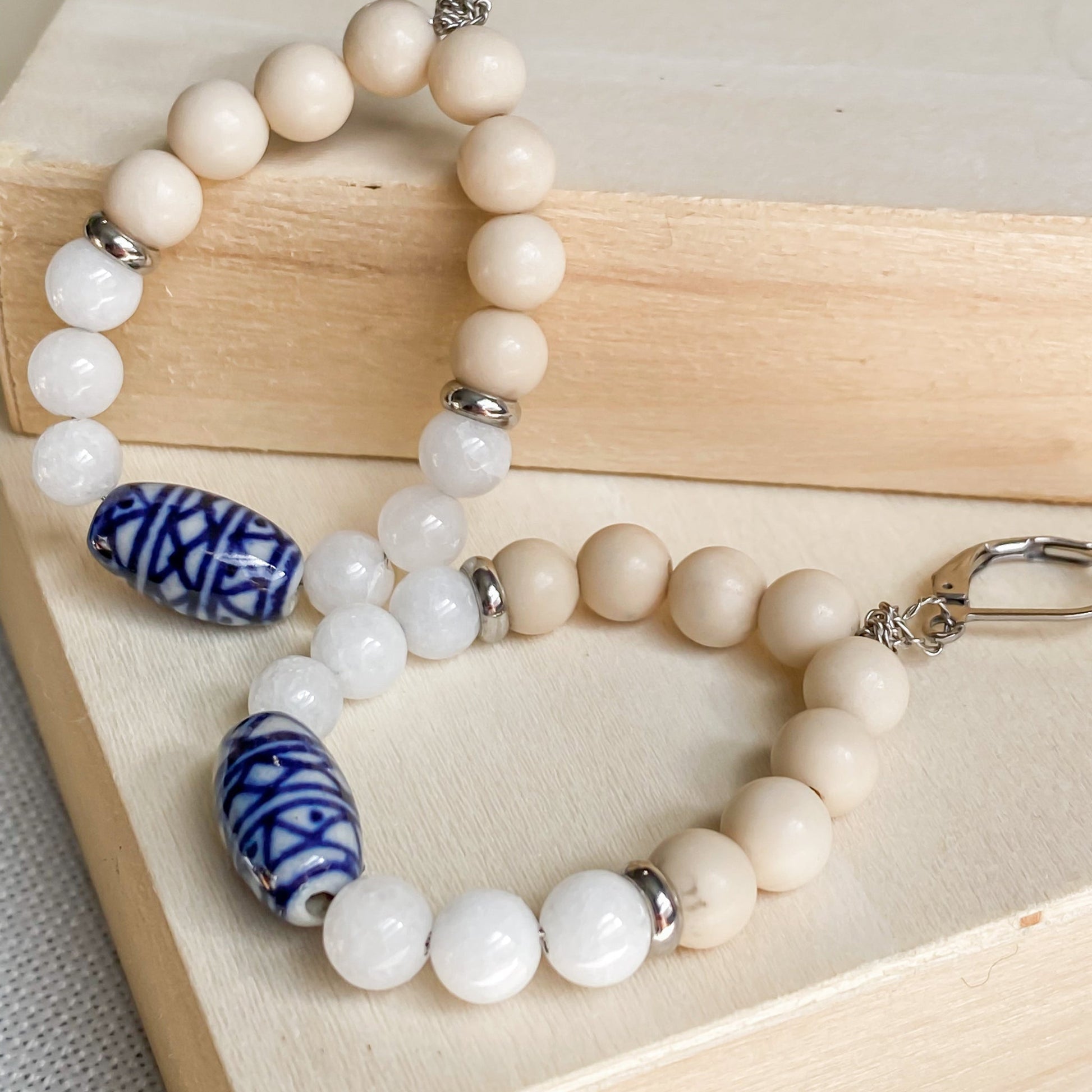 Les boucles d’oreilles bohèmes pendantes Naxos prolongent l’esprit de l’été et t’invitent au voyage. Inspirées des paysages méditerranéens et de l’artisanat grec, elles associent des pierres semi-précieuses véritables à la céramique blanche et bleue. Un bijou audacieux, gypsie chic et artisanal, conçu pour celles qui aiment se distinguer.