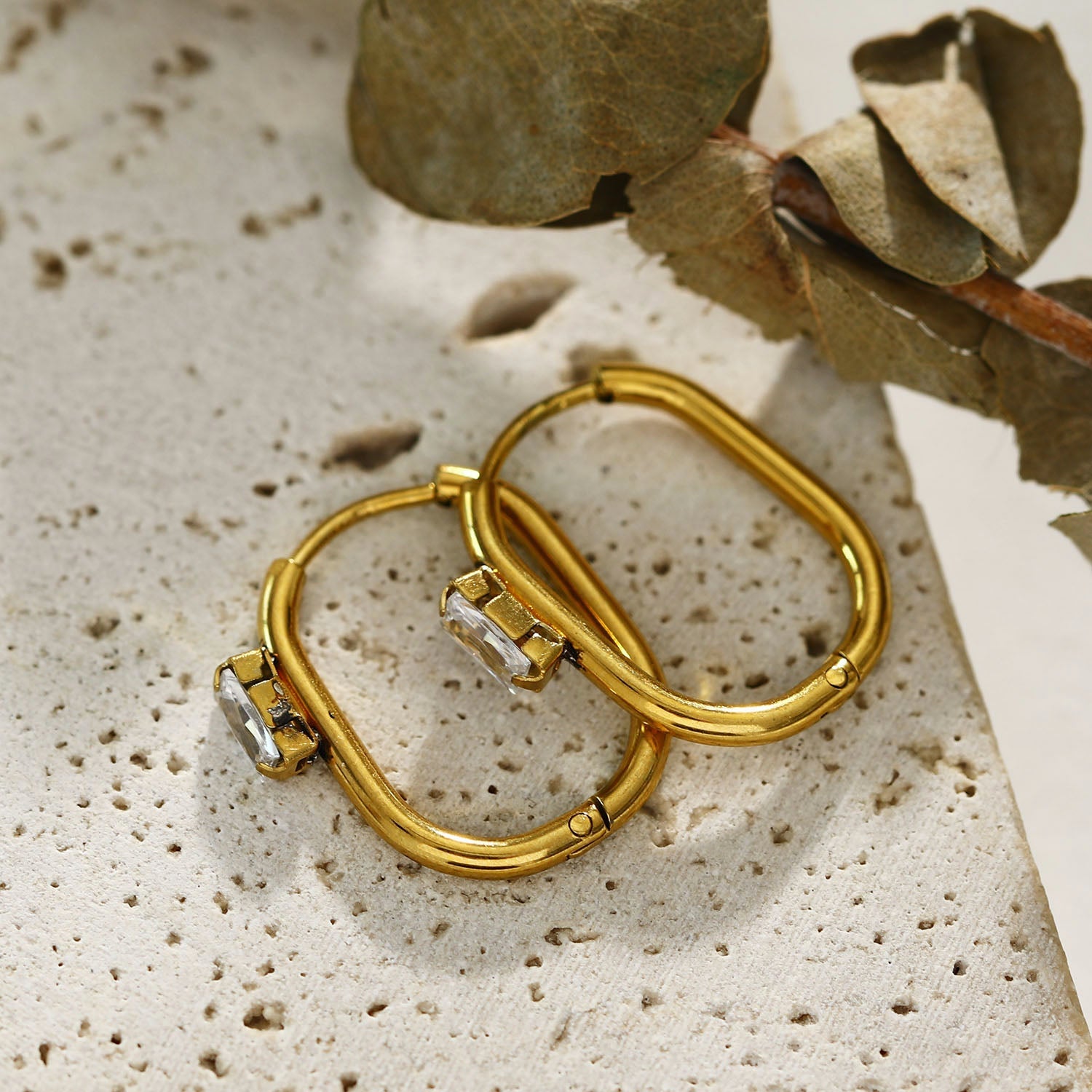 Subtle & pretty, add a dash of understated style to your outfit. A solitaire zirconia shines from the center of this rectangular shaped hoops. Rounded corners add to the simple elegance of this timeless piece.