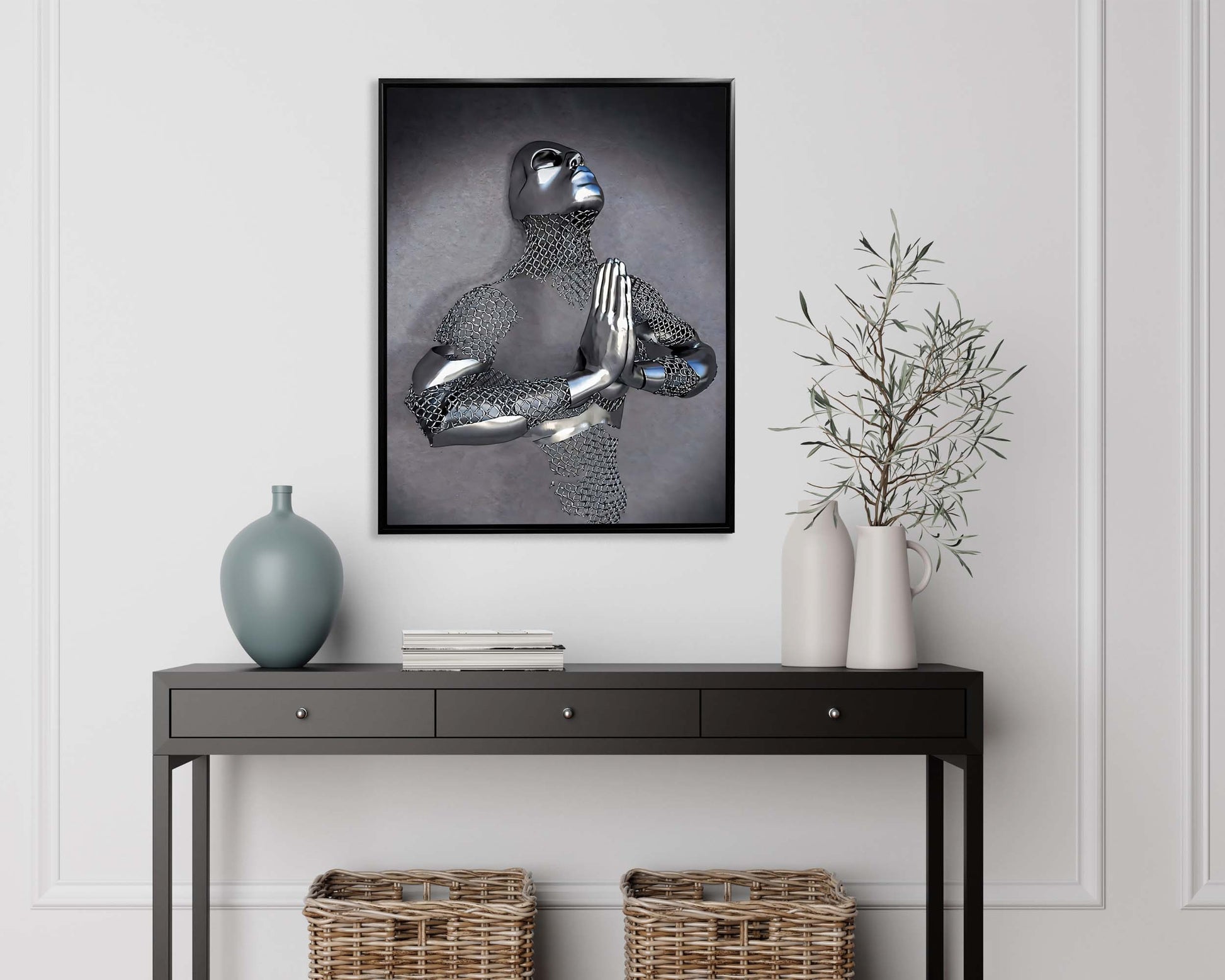 This high-quality Fine Art Canvas features a powerful and thought-provoking image that beautifully captures the complexities of the human condition. Through the use of contrasting elements, such as metal and real human emotion, this 36" wide x 48" high canvas offers a unique perspective on the delicate balance between technology and humanity.
