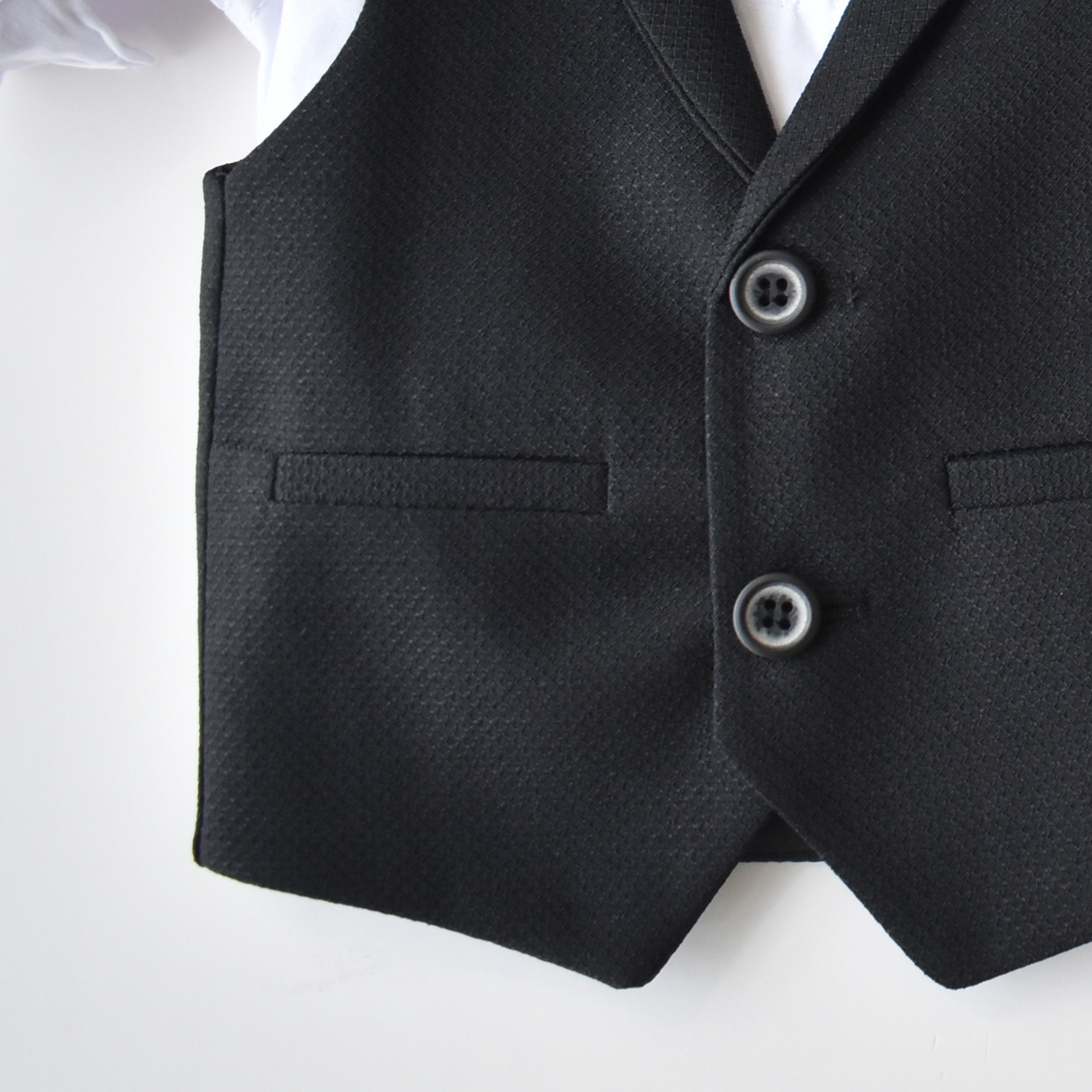 This is taking the vest set style to a new level. Stylish knit cotton vest set including sleeveless vest, soft cotton shirt, and slim fit adjustable waist knit cotton pants, and matching bowtie. A real superstar in the making!