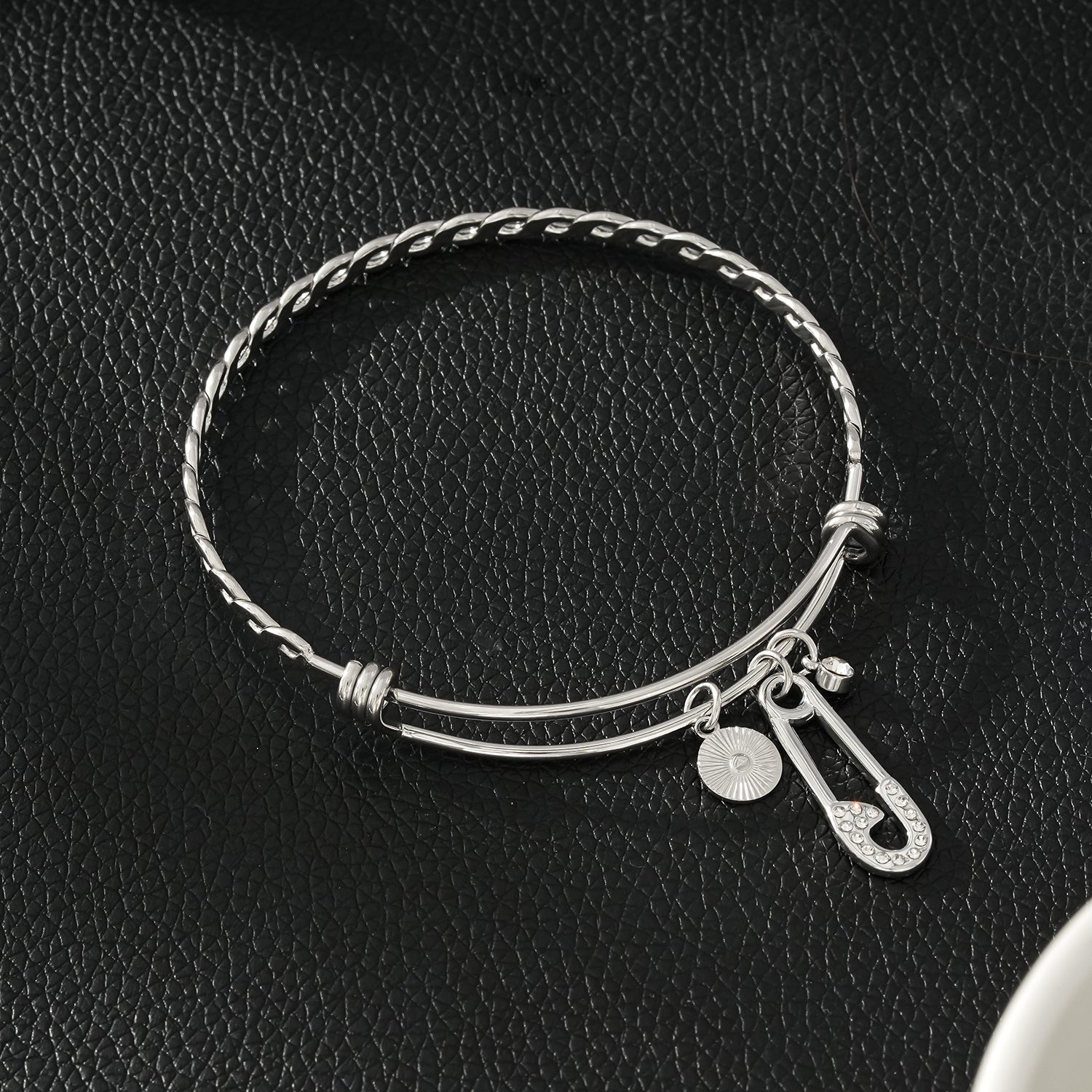 Edgy yet elegant, the Christina bracelet is adorned with a decorative disc, a Zirconia embedded safety-pin and a symbolic single Zirconia gemstone.