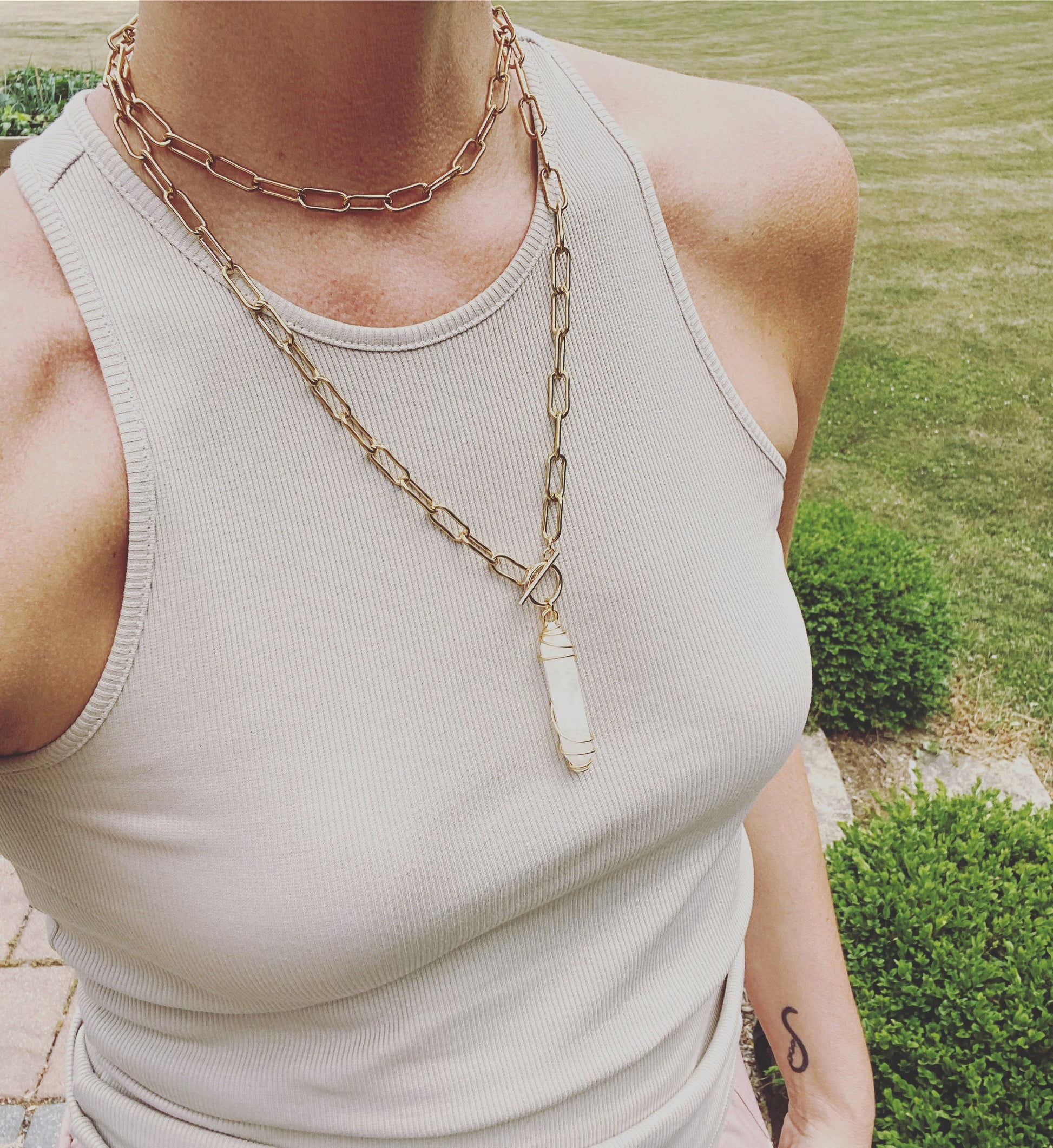 Clear Quartz is one of the most powerful stones. It cleanses negative energy, it heals the body, it stimulates positivity and it brings the body into balance. Wearing this beautiful double wrap necklace will bring those powers into your being. This necklace is created with 38 inches of golden stainless steel paper clip chain, a stainless steel toggle and a natural clear quartz pendant.