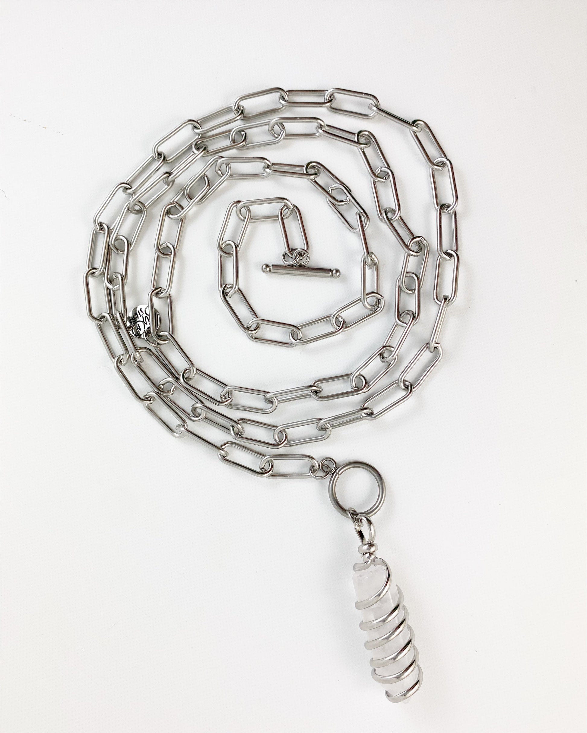 Clear Quartz is one of the most powerful stones. It cleanses negative energy, it heals the body, it stimulates positivity and it brings the body into balance. Wearing this beautiful double wrap necklace will bring those powers into your being. This necklace is created with 38 inches of silver stainless steel paper clip chain, a stainless steel toggle and a natural clear quartz pendant.