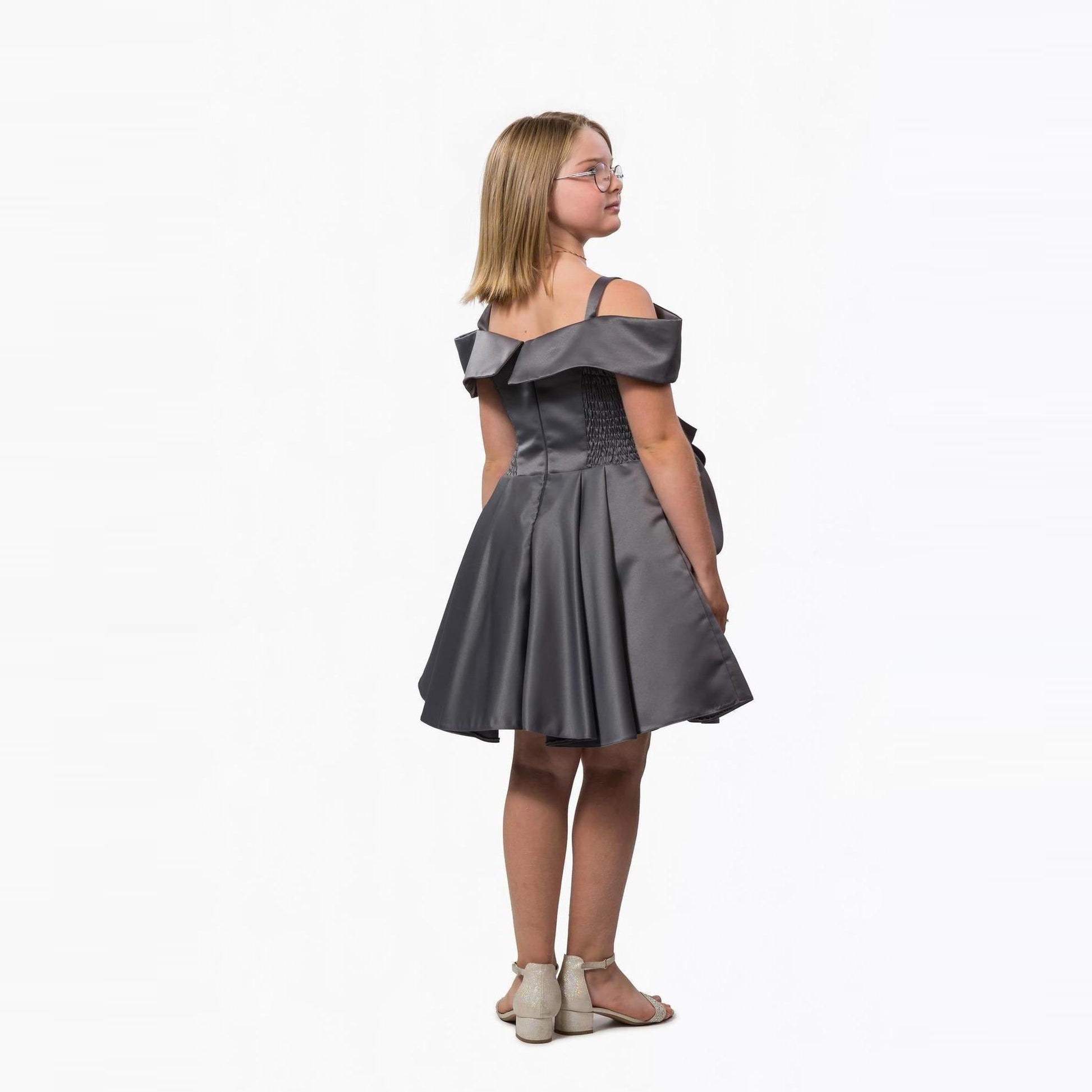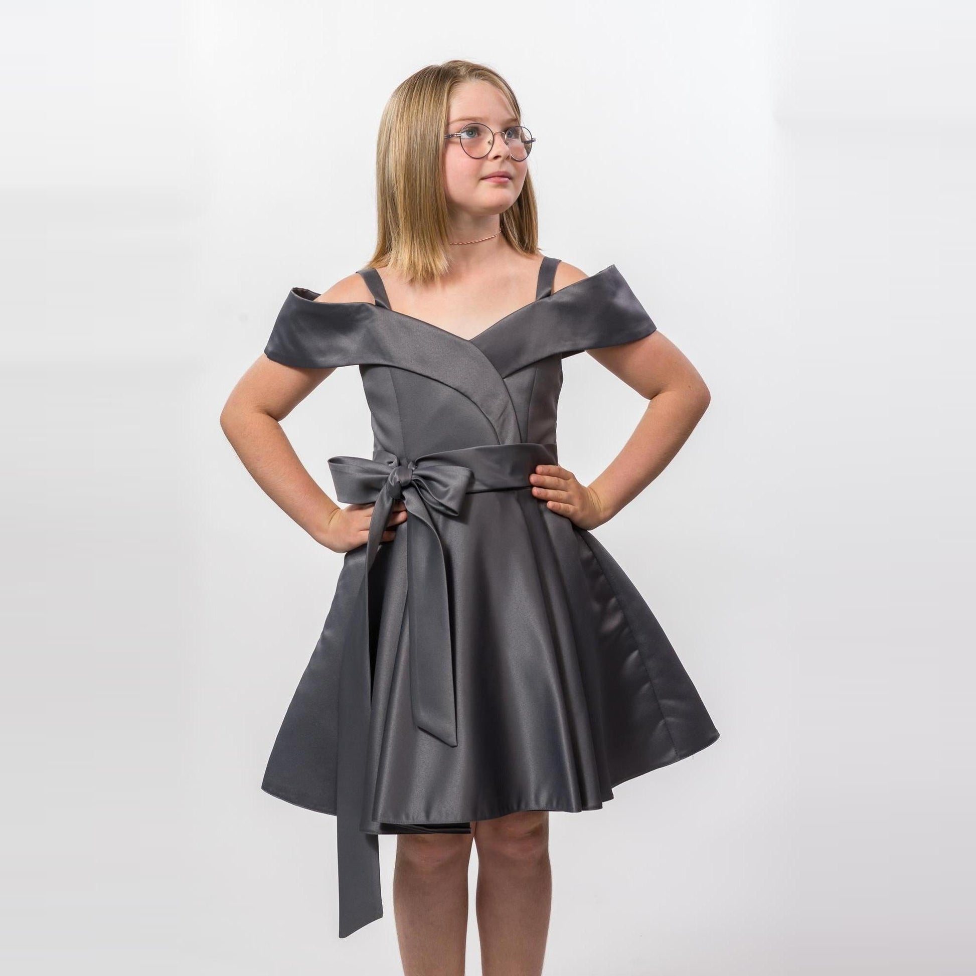 Definitely one of its kind, your pre-teen will look stunning in this beautiful short satin dress with off-shoulder satin sleeves and attachable front satin belt. A JuniorKids exclusive creation!
