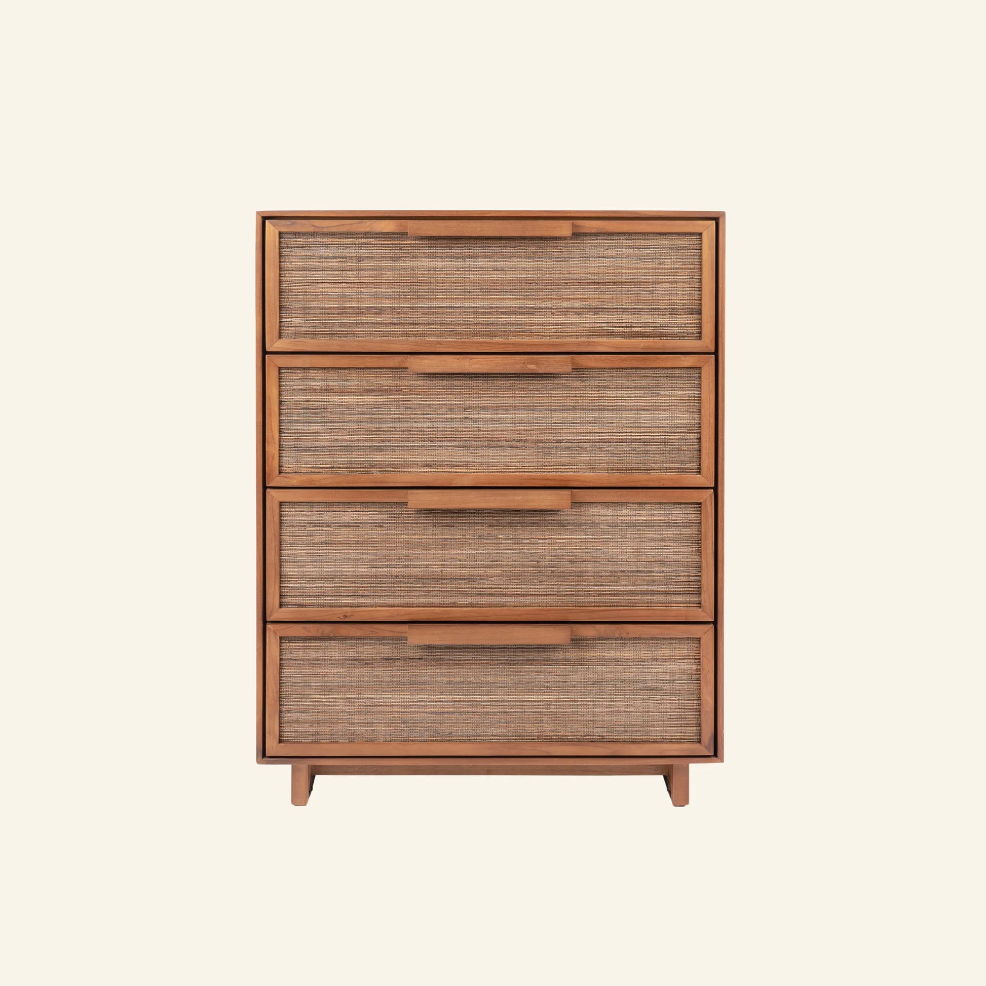 Conçu et fabriqué pour compléter n'importe quelle pièce, à la fois élégant et pratique. Fabriqué à la main à partir d'une synthèse de teck récupéré et de tiroirs à fermeture douce recouverts de feuilles de nervure de coco tissées à la main, ce beau meuble s'intègre parfaitement dans les habitations traditionnelles et contemporaines.