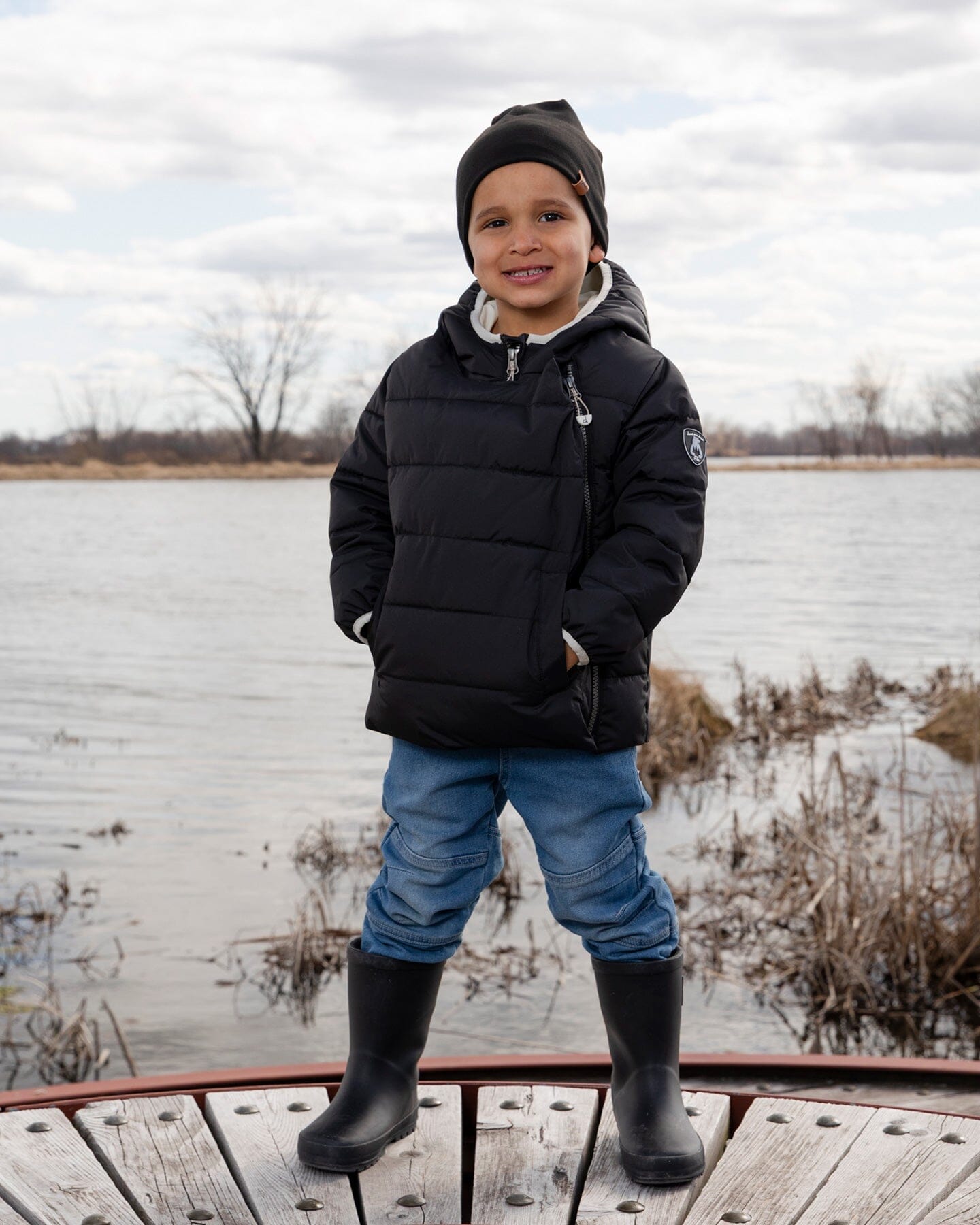 Designed for cold protection down to -20°C (-4°F), our puffy winter jacket is car seat compatible, coated for waterproofing, and constructed for comfortable breathability and maximum warmth. Filled with compressible insulation, this puffer coat in black features a protective wind flap and chin guard, extendable cuffs, a dirt-repellent BIONIC-FINISH® ECO coating, and functional front pockets.