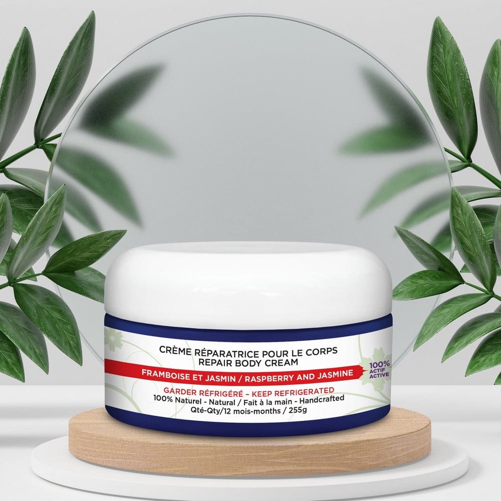 Découvrez notre crème pour le corps I Framboise et Jasmin, conçue avec soin à Hemmingford, Québec au Canada. Fabriquée à partir d'extraits puissants de plantes cultivées localement, cette crème vous procurera une peau douce et hydratée.