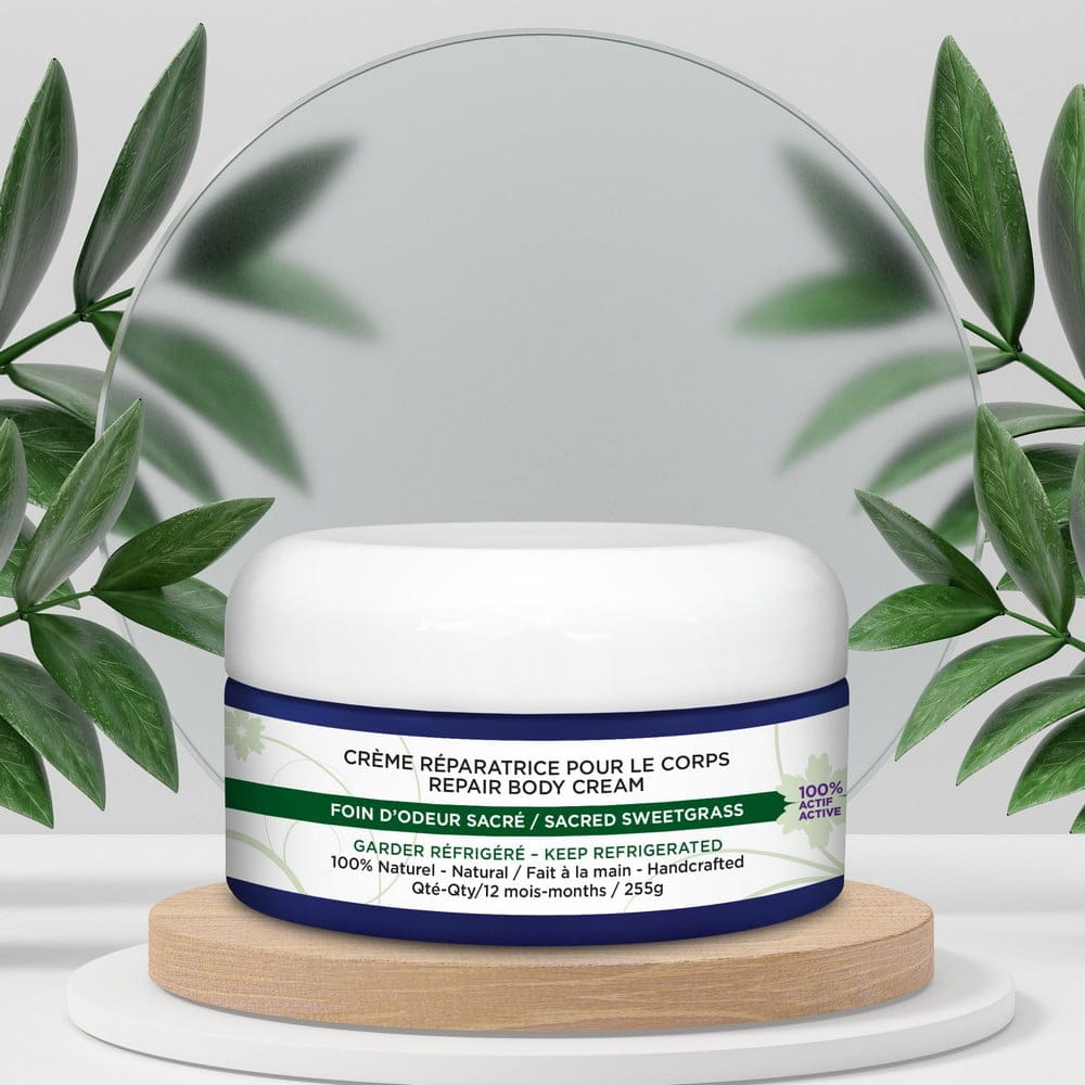 Découvrez notre crème pour le corps I Foin d'odeur sacré, conçue avec soin à Hemmingford, Québec au Canada. Fabriquée à partir d'extraits puissants de plantes cultivées localement, cette crème vous procurera une peau douce et hydratée.