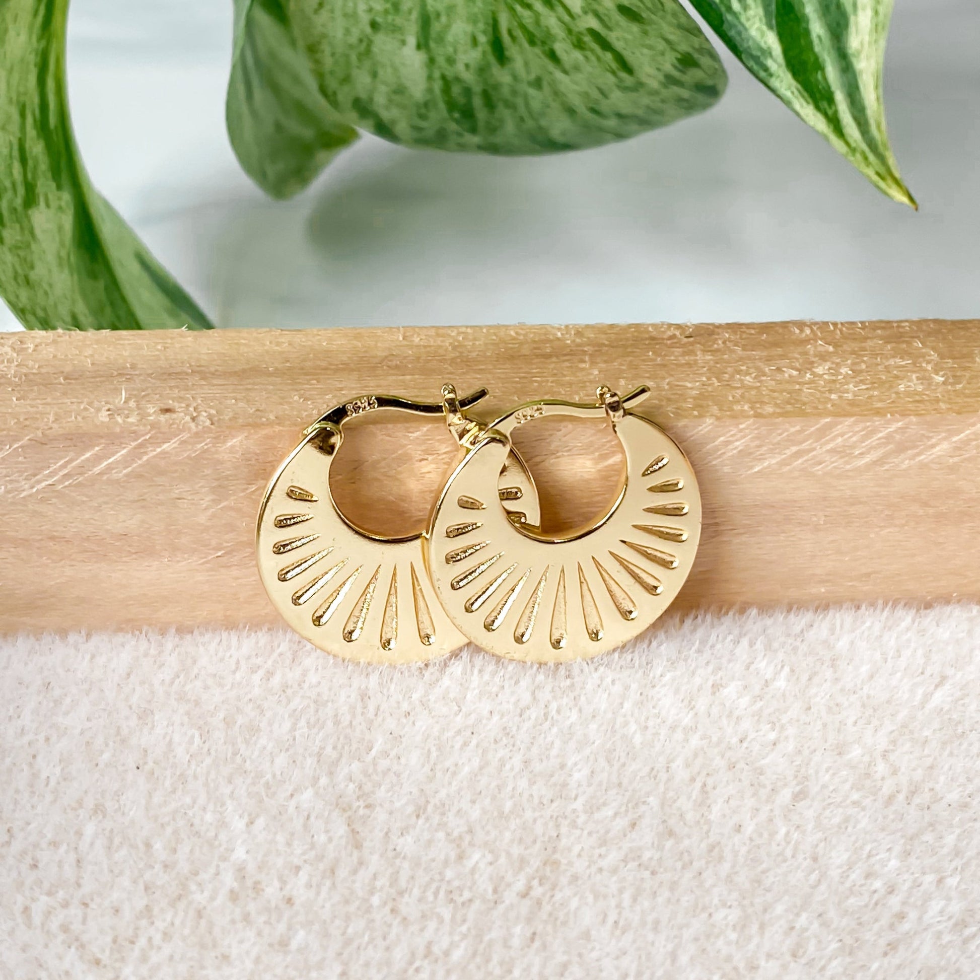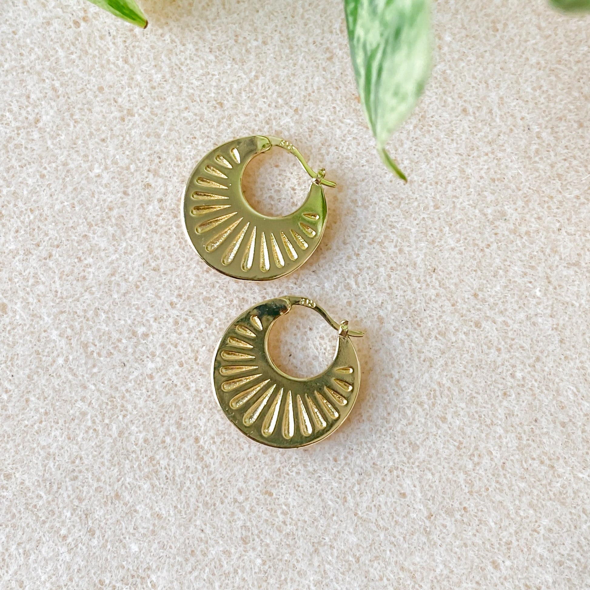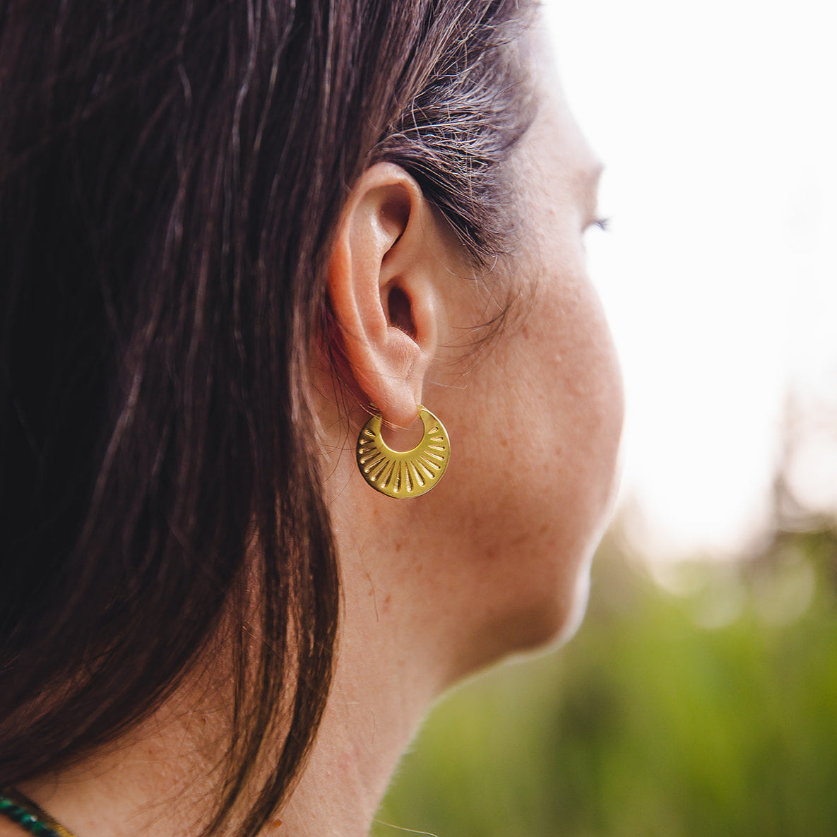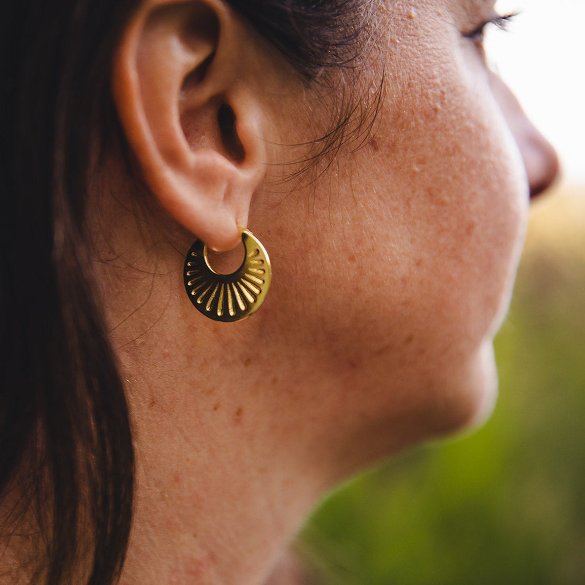 Leur design ajouré et texturé fait écho aux rayons du soleil : une pièce lumineuse, simple et intemporelle, qui s’associe facilement à tes autres bijoux. Tu peux aussi les porter avec d’autres boucles d’oreilles si tu as plusieurs trous aux oreilles, pour créer un look unique qui reflète ton style.
