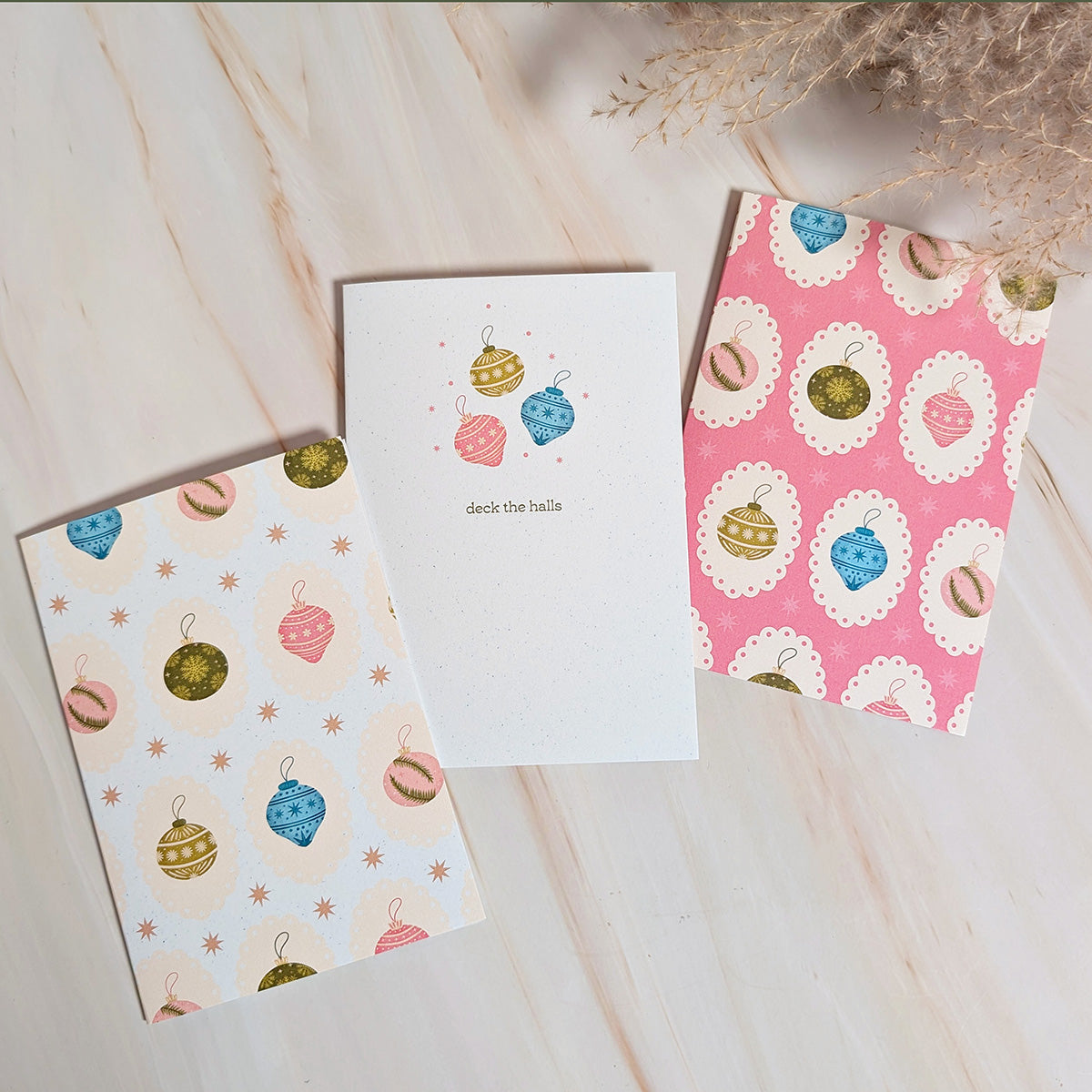 Deck the halls in style with this festive ornament card, featuring three beautifully illustrated baubles ready to bring holiday cheer. Perfect for sending seasonal joy to friends, family, or anyone who loves classic holiday decor. The blank interior gives you all the room you need for a personalized greeting that sparkles with holiday spirit.
