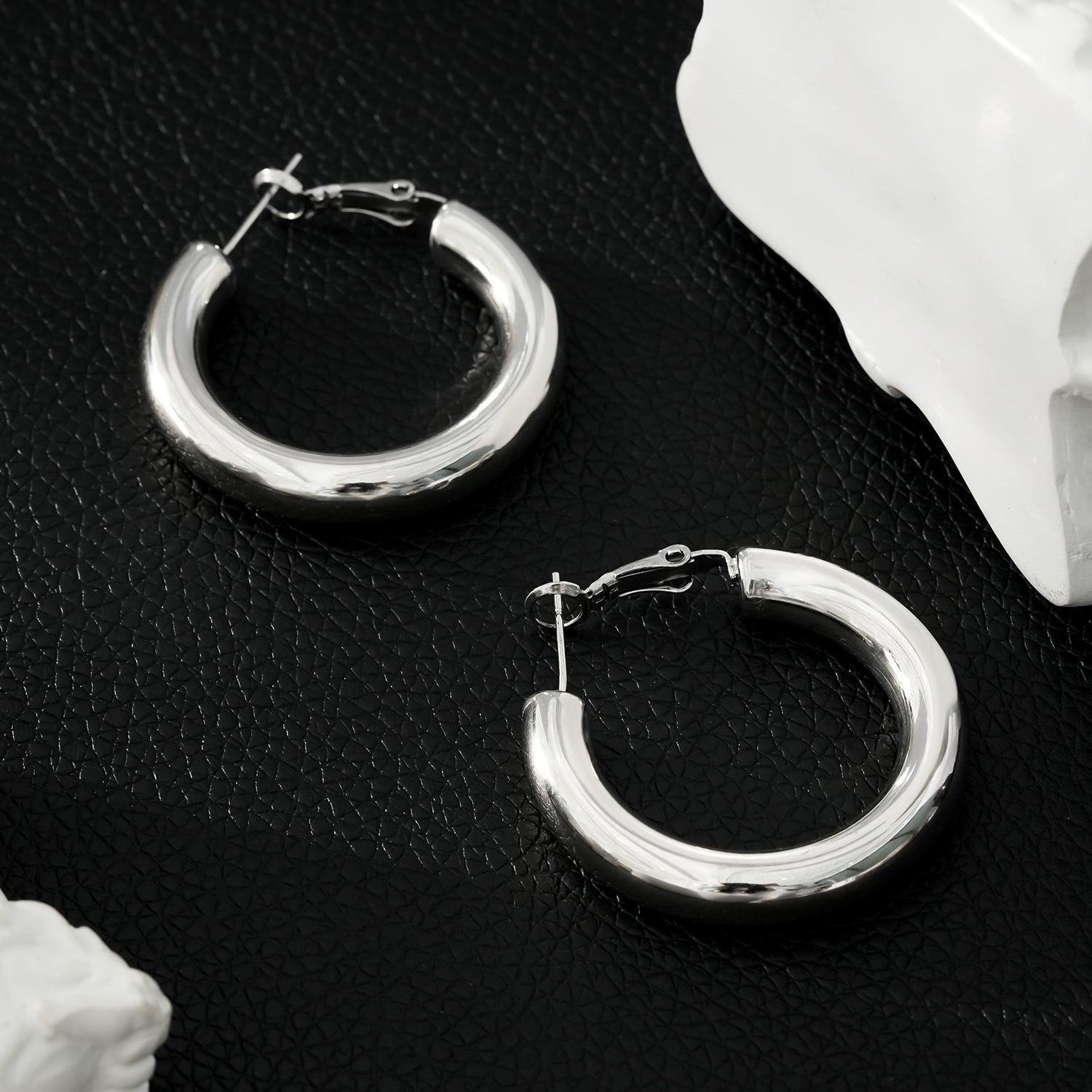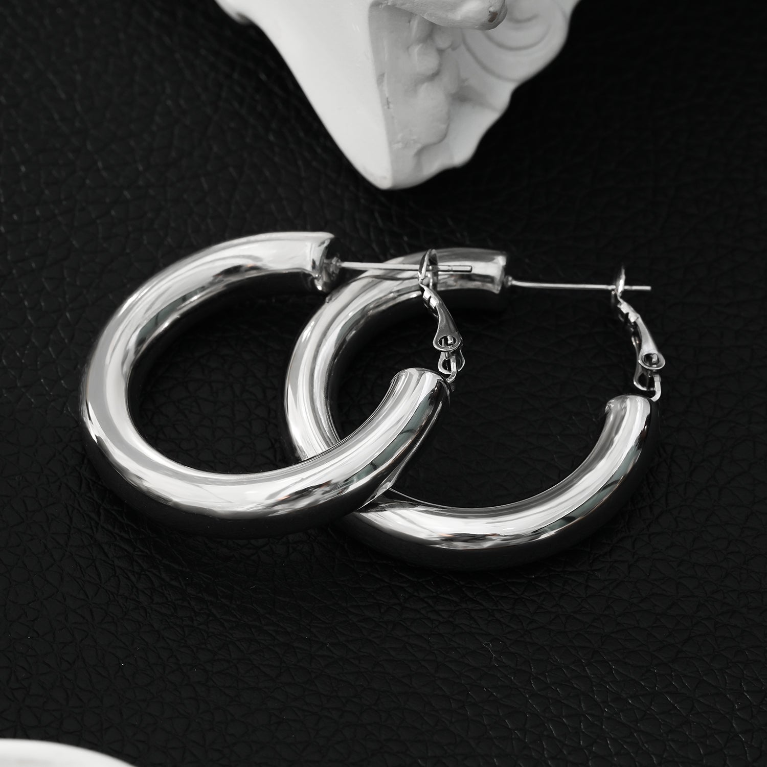 DERIVIER Silver (White Gold): Semi-Wide Essential Hoop Earrings (3.5cm)