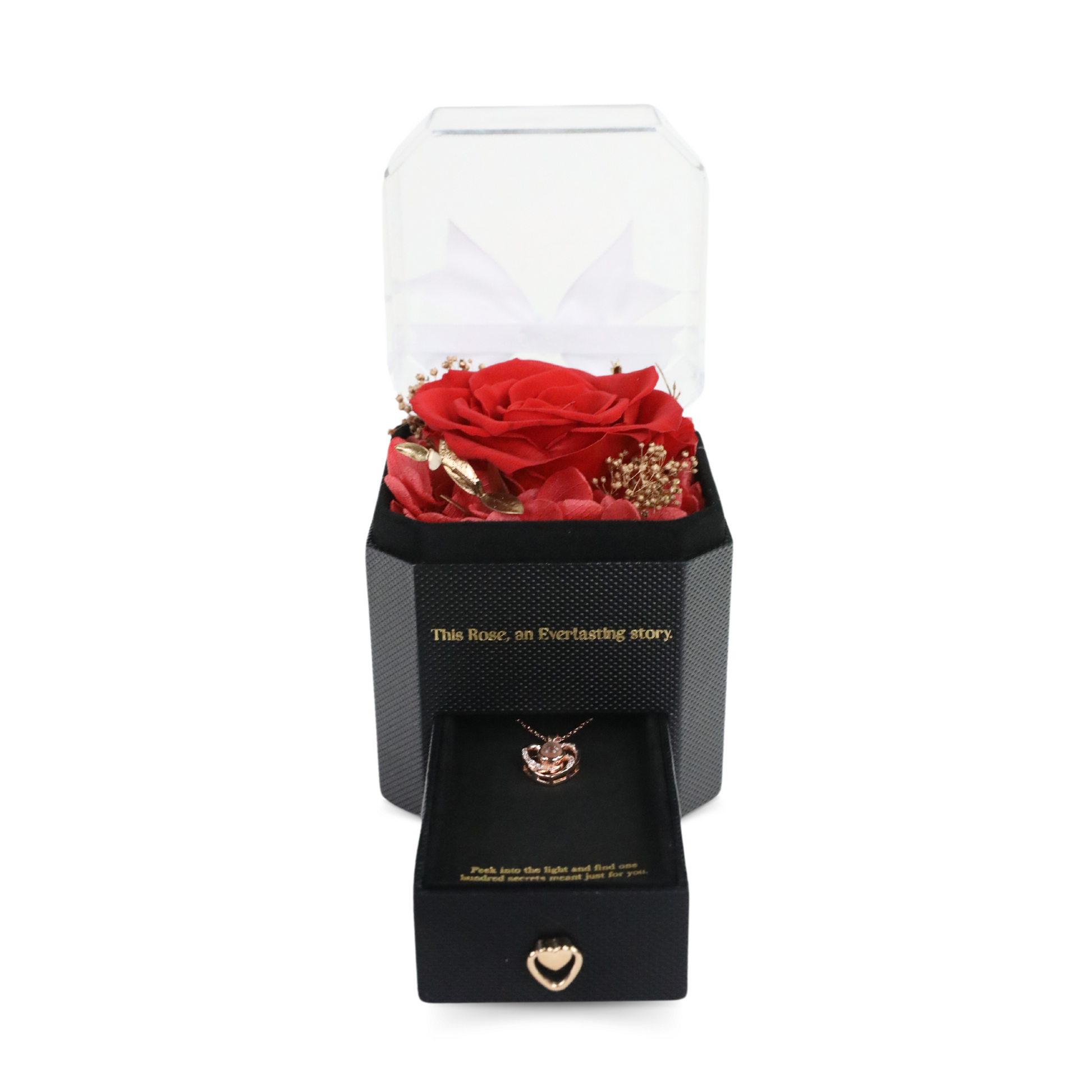 The Everlasting Memories Rose is a 100% real rose, meticulously preserved to last for years, available in two enchanting colors: red and pink. This unique gift comes in a small, elegant box with a glass top that showcases the stunning rose. Below the rose lies a delightful surprise: a beautiful heart-shaped necklace.