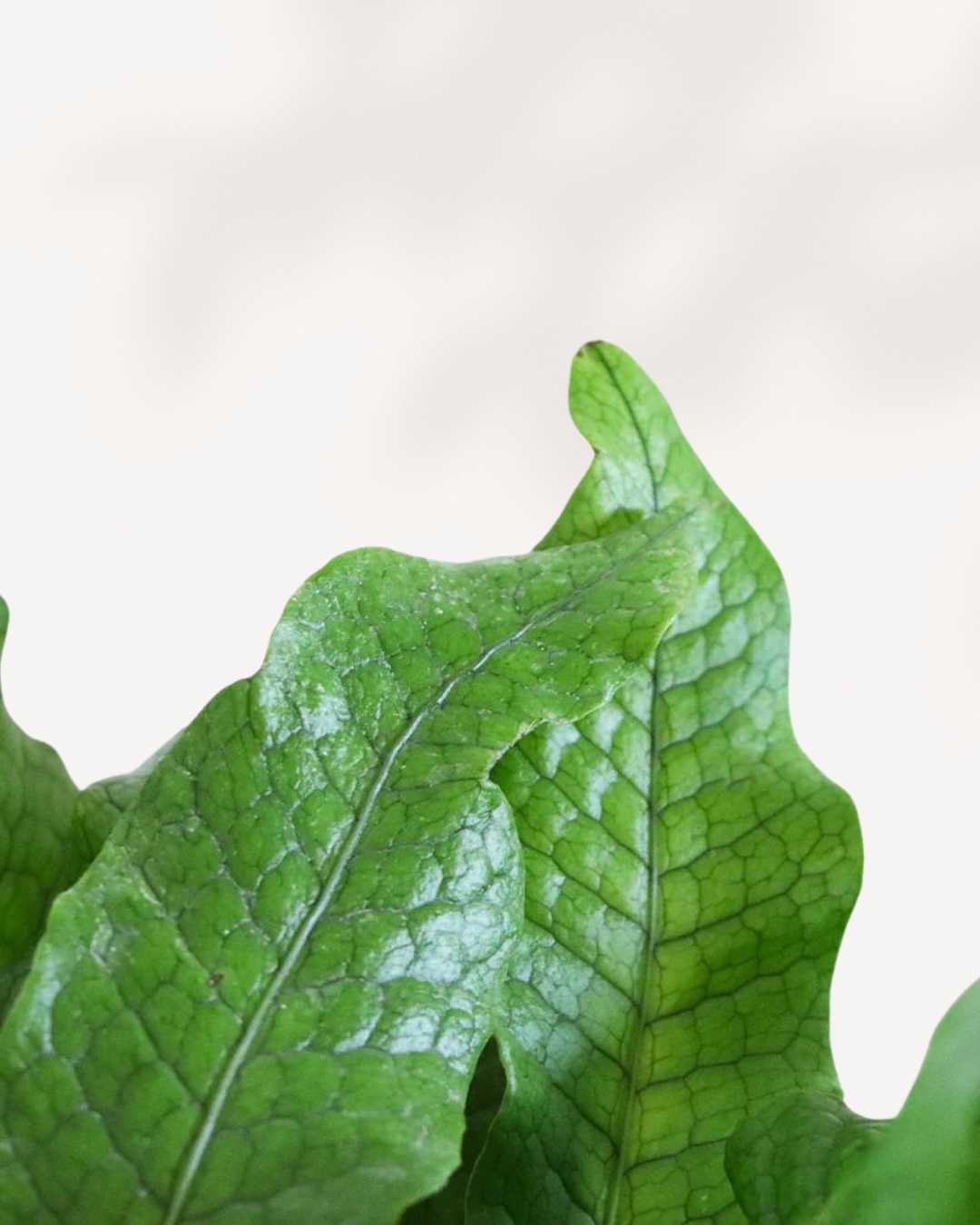 Crocodile Fern features elongated, leathery fronds with dark green veins and textured patterns resembling reptile scales. Its glossy leaves grow in an upright form, adding height and texture to any space.