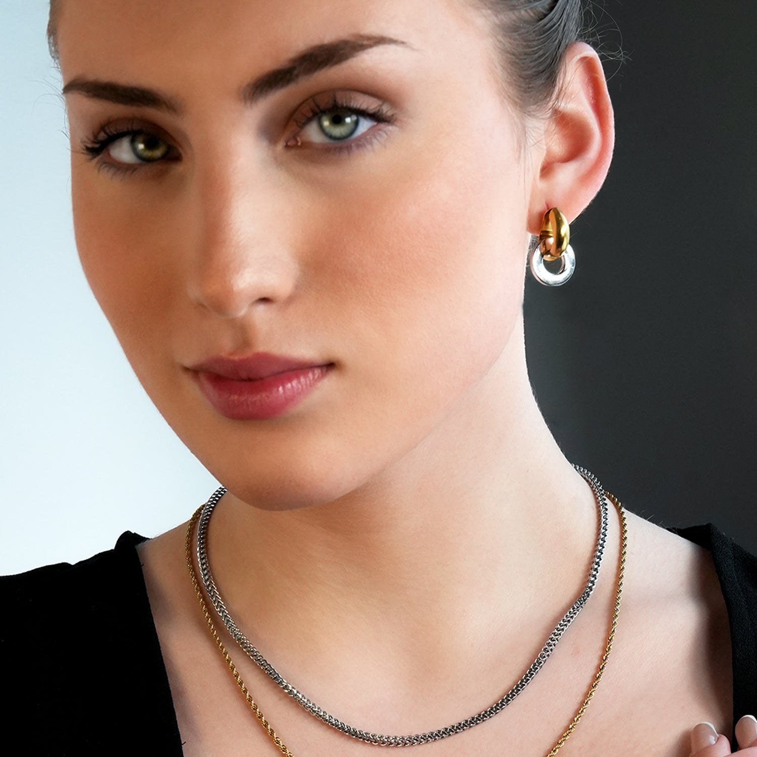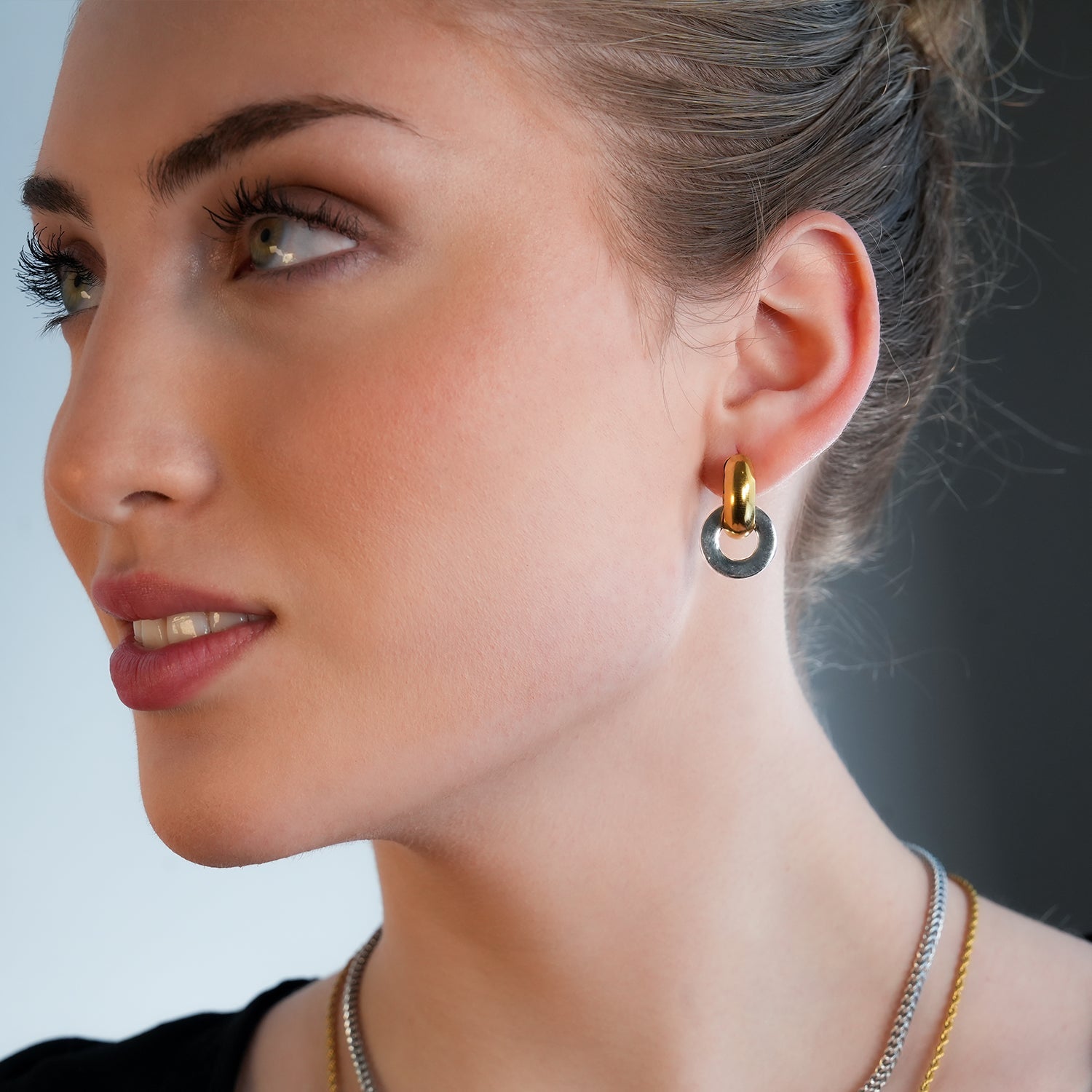 Upgrade your accessory game with our stunning Mixed Metals Double Hoop Geometric-Chic Hoop Earrings These are perfect for those who love minimalistic designs with a contemporary edge. Crafted with precision, the contrast in the gold & silver hoops sdds an eye catching aesthetic to any outfit.