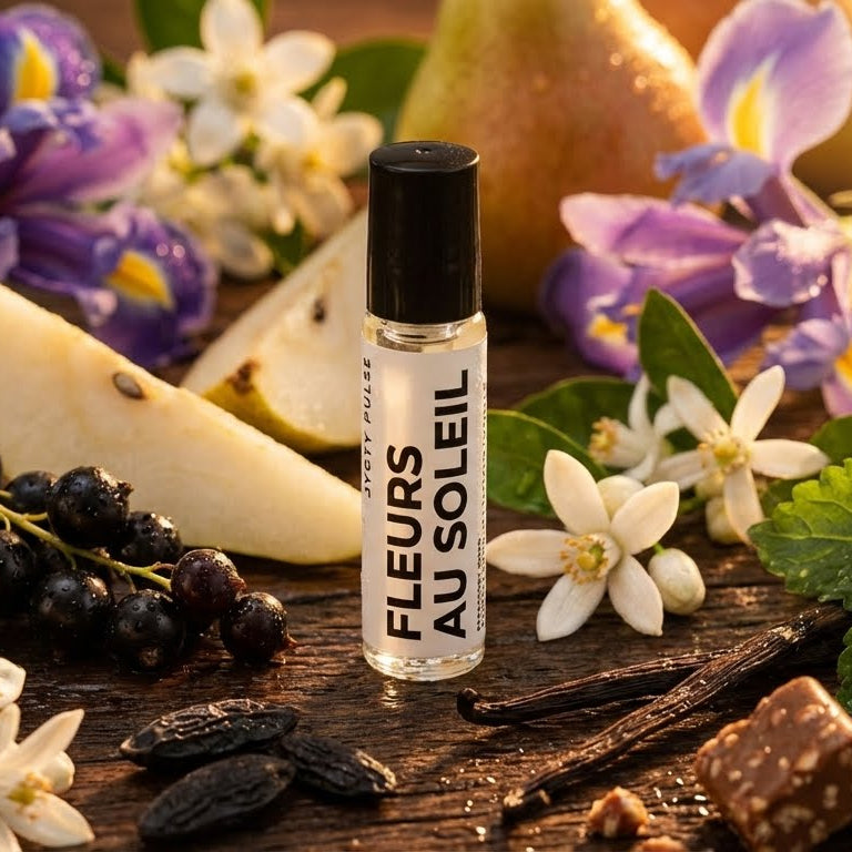 FLEURS AU SOLEIL. This sensually rich perfume oil, Fleurs Au Soleil, is created from some of the most luxurious notes nature has to offer, resulting in a smell that is both irreverent and addictive. Fruity notes of black currant and pear give way to an elegant heart of Iris and Jasmine, elevated by a base of praline, patchouli, and tonka bean. A distinctive fragrance emboldened by luxury, it’s the purest expression of unapologetic glamour.