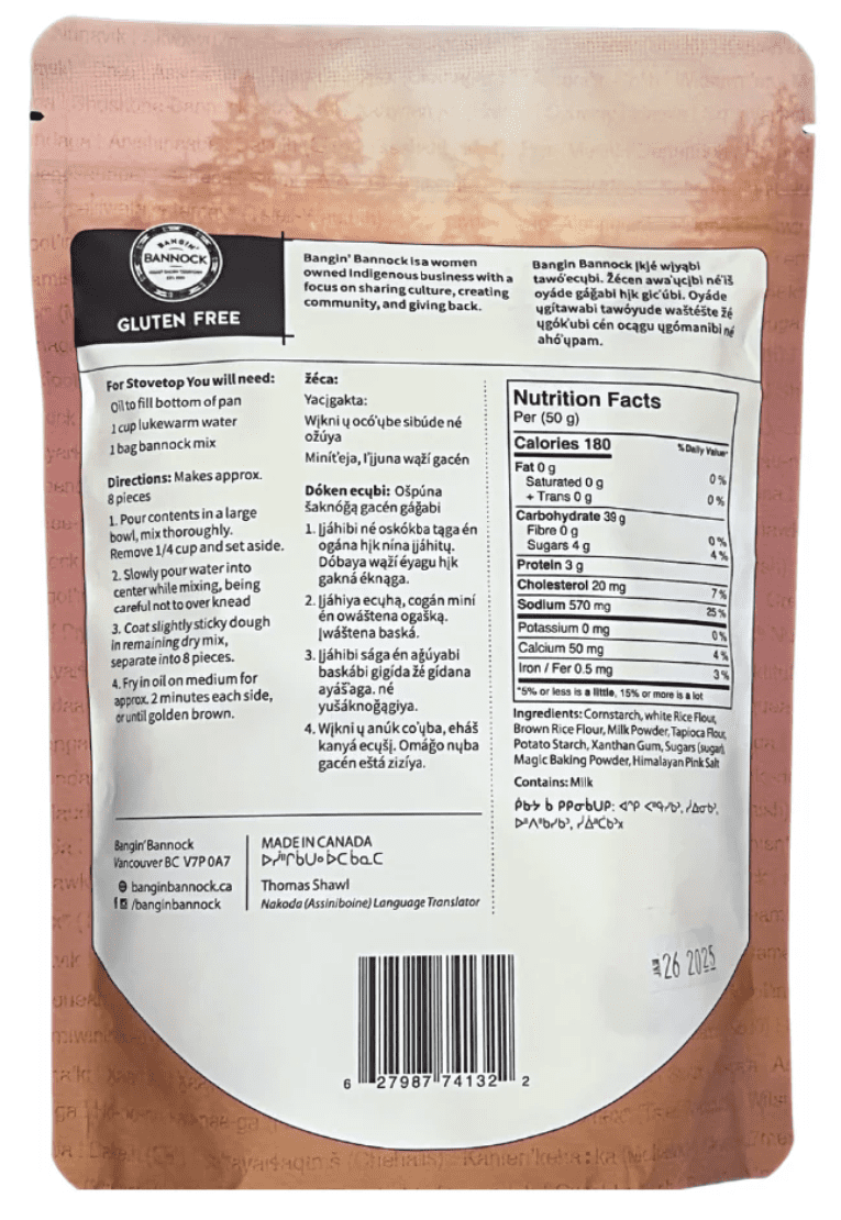 Bangin' Bannock is a women-owned Indigenous business. Easy recipe, just add water to mix and fry in oil until golden brown. Also available in Gluten Free!
