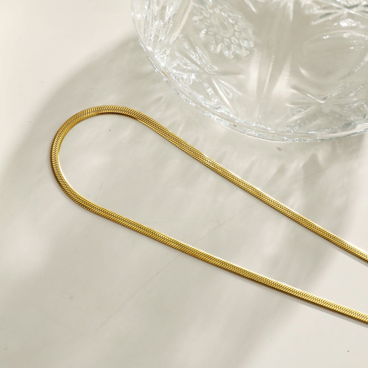 Add a subtle touch of style. A fine width refined gold snake chain texture, also known as a herringbone texture will add a classic touch to your outfit.