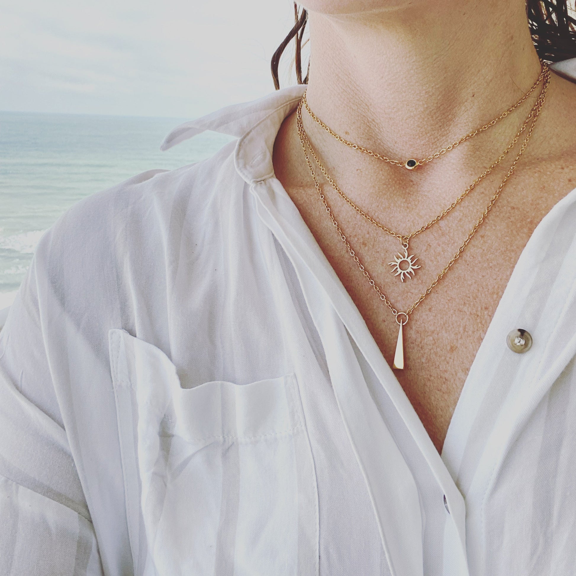 Want a layered look without the hassle of creating it yourself. Our golden sunburst necklace is made with three distinct and delicate strands. Made from gold stainless steel (lengths range from 14-18 inches with a 2 inch extender). Creates a perfect layer!