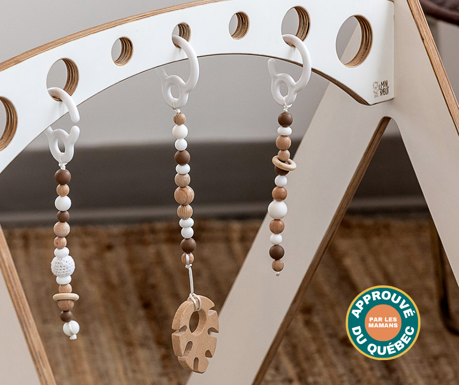 Le gym en bois est durable, c’est le genre d’item qu’on pourra se refiler d’ami en ami, de cousin en cousin, de Mini Sportif en Mini Sportif. D’ailleurs, tu as là un excellent cadeau de shower. Mention spéciale à l’arc troué – au design assez unique – qui te permet d’attacher des jouets à suspendre pour stimuler bébé.
