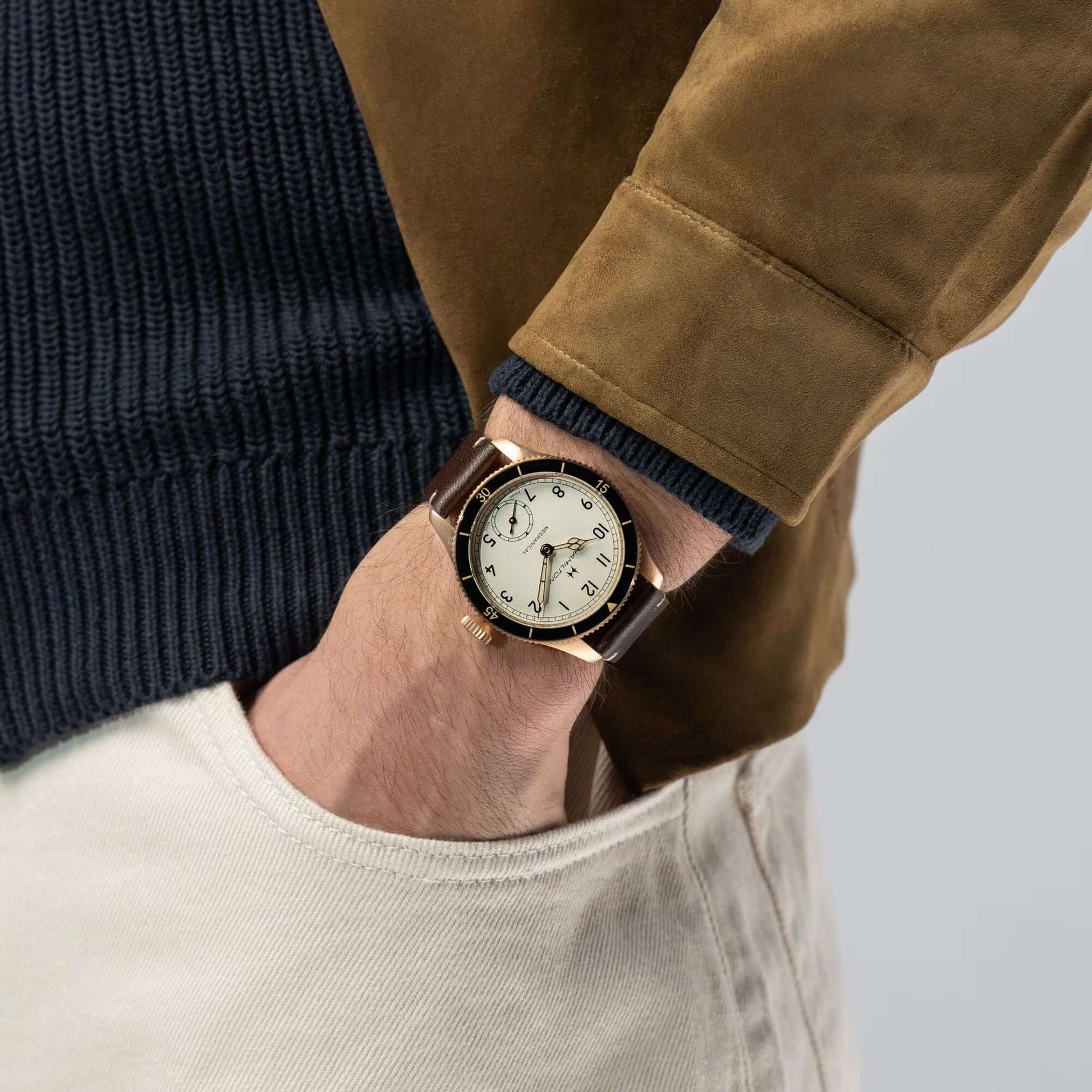 With its distinctive retro charm, the Khaki Pilot Pioneer Mechanical 43mm continues to honor Hamilton’s rich aviation and military heritage. Equipped with a mechanical movement and 50-hour power reserve, this timepiece features a bronze case with an eggshell-white dial and burgundy leather strap, for a look that'll never go out of style.