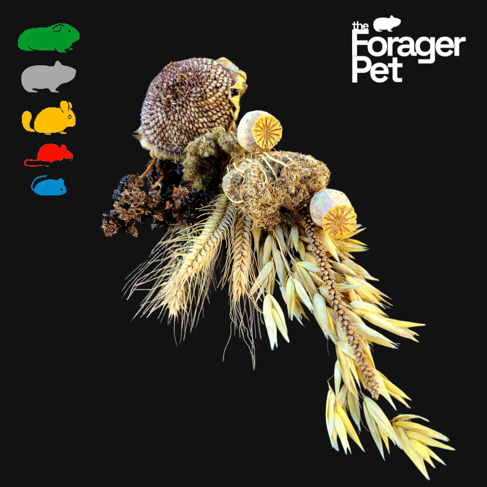 This lively forage mix is crafted just for hamsters and other tiny foragers. Packed with a colourful variety of intact seedheads and grains—from sunflower and poppy to carrot tops and plantain—each spray offers texture, flavour, and fun. These natural treats not only boost nutrition, but also give your pet a chance to dig, strip, and stash like they would in the wild.