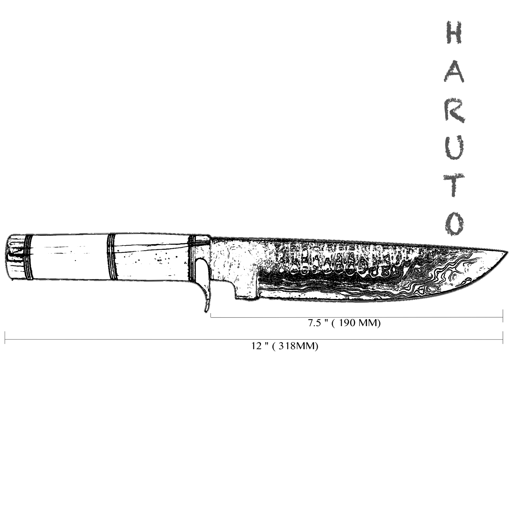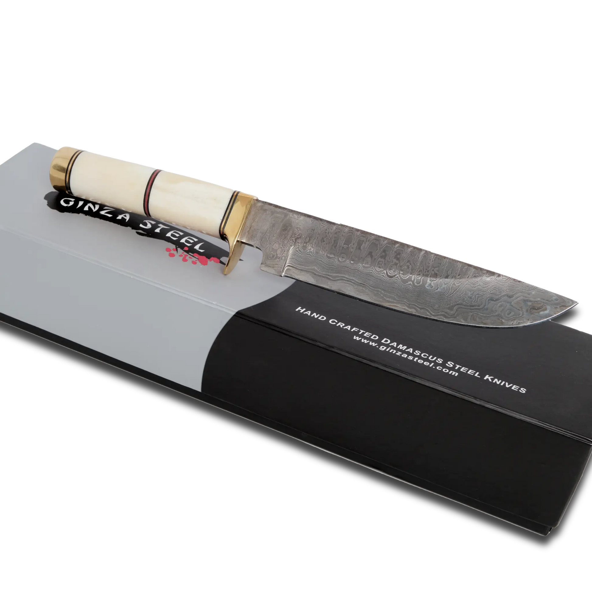 Ginza Steel Haruto Bowie Knife is a stunning collector's piece with 256 layers of Damascus Steel, creating unique patterns on each blade. The luxurious handle, made from real camel bone, offers exceptional comfort. Crafted by expert sword smiths with generations of experience, each knife is unique. Comes with a hand-stitched leather sheath