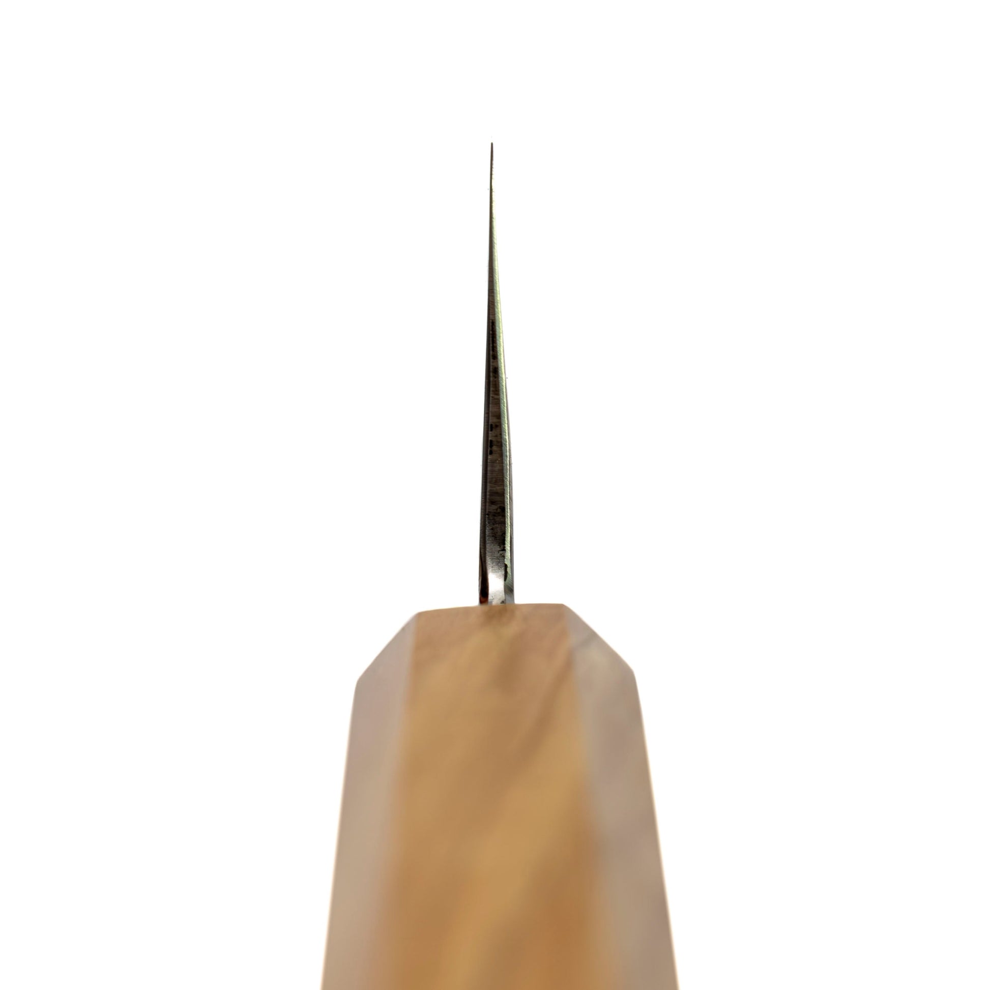 Santoku translates to three virtues. Meat, fish, and vegetables, or slicing, dicing, and chopping. No matter what way you look at it, it implies the versatility of the knife. While you sacrifice some of the slicing capability of a larger gyuto, don't be fooled by its size, the santoku can get 99% of your kitchen tasks done without breaking a sweat, which is probably why its the most popular shape in Japanese home kitchens.