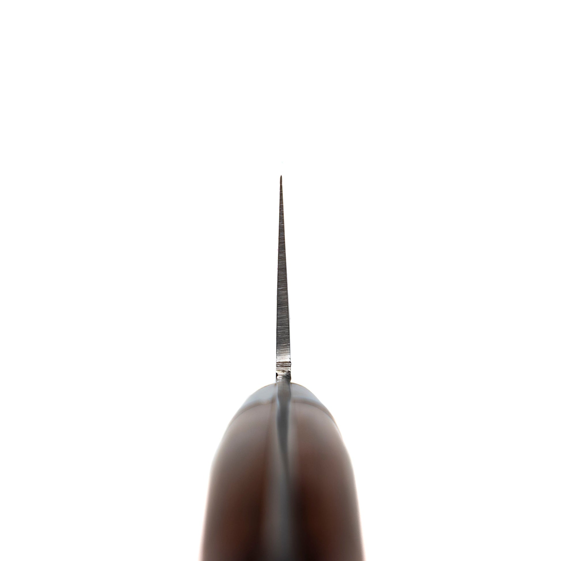 This is a fantastic starter Nakiri for the home cook or professional chef looking for an easy to maintain, high performing and good looking vegetable knife. The VG-10 steel won't rust or discolour even if it's not wiped down immediately after use and it has very good edge retention. The wavy damascus pattern blends beautifully with the tsuchime "hand hammered" finish and is further complemented by the brown pakka wood handle. The triple riveted handle ensures this knife will stand up to the toughest kitchen conditions and is comfortable to grip.