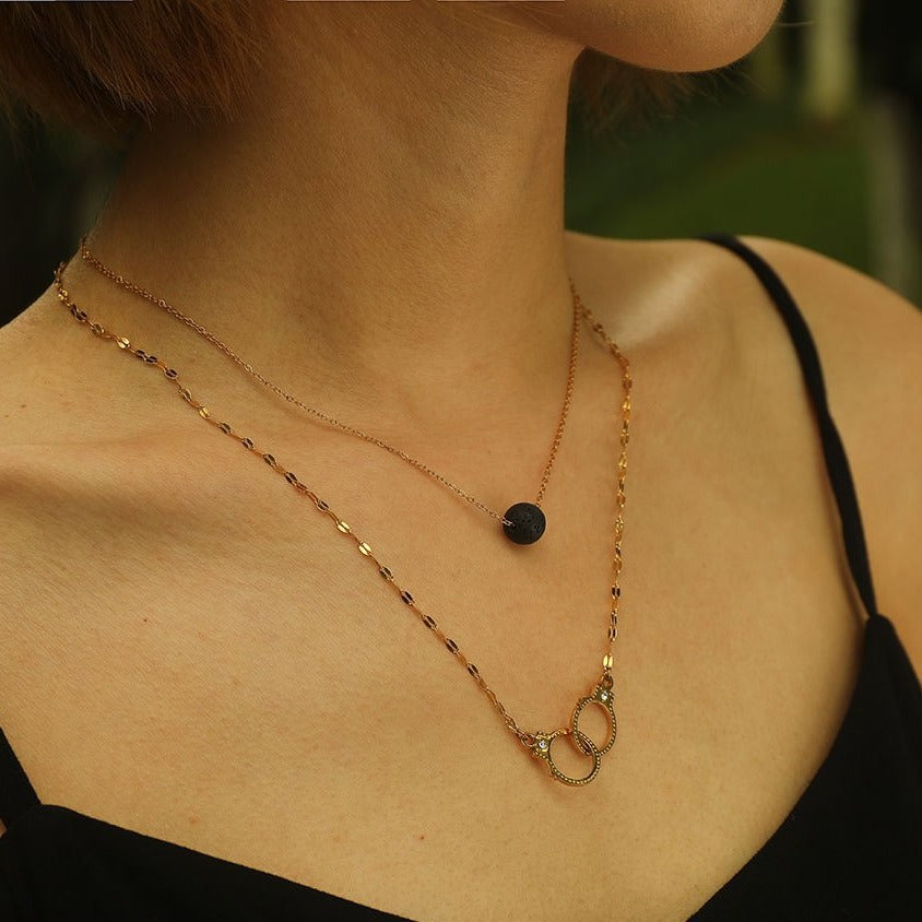 Layer 1: Dainty Chain Anchoring a Natural Lava Stone Charm.Layer 2: Mini Oval Linked Chain with Zirconia Gemstone Embedded Cute Hand Cuffs.