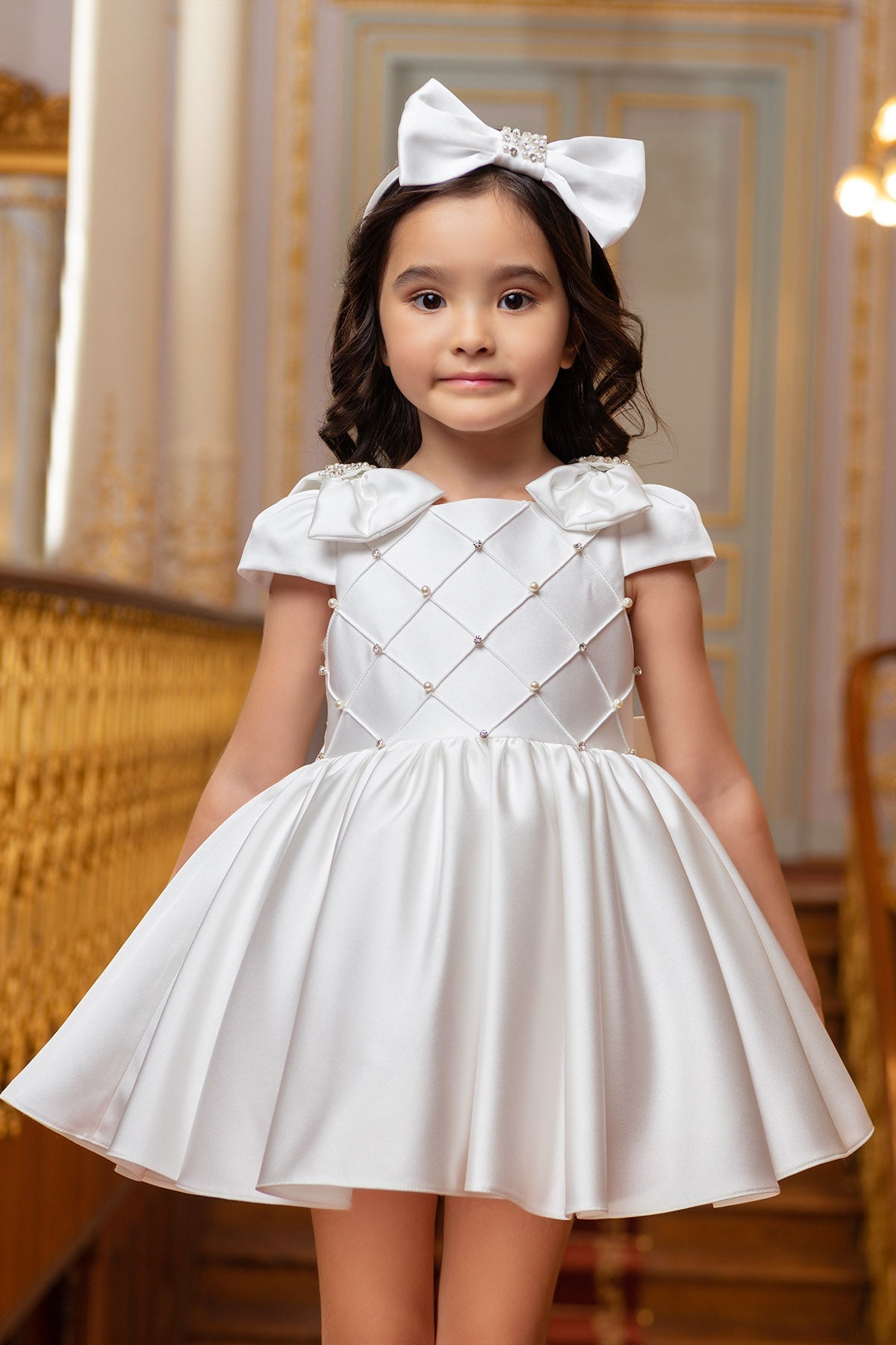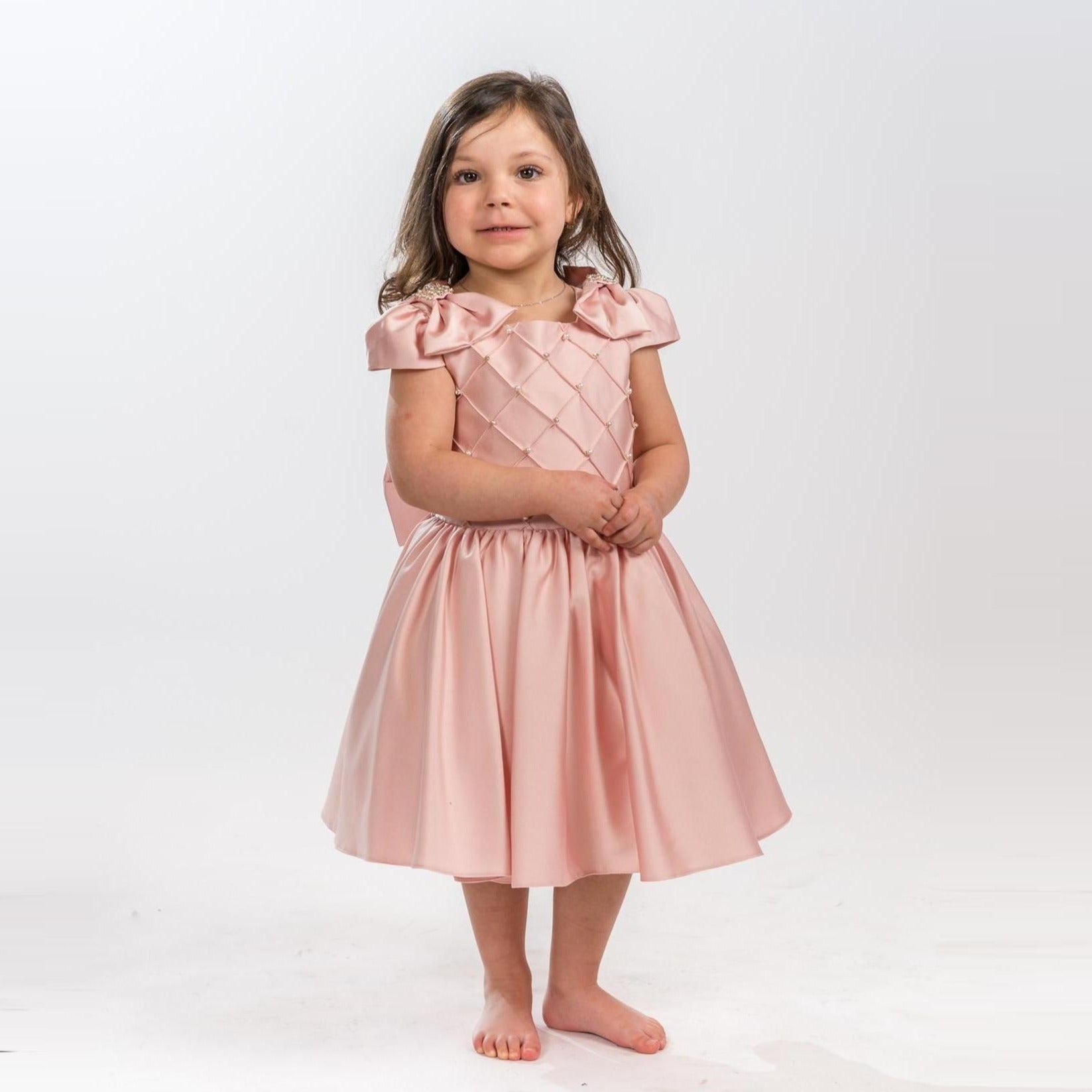 A stunning satin short dress with cap sleeves and satin bows on the shoulders, a nice crisscross style top, pleated skirt, and a removable bow in the back. This elegant dress is comfortable for kids with its cotton fabric lining. A JuniorKids Luxury exclusive design.