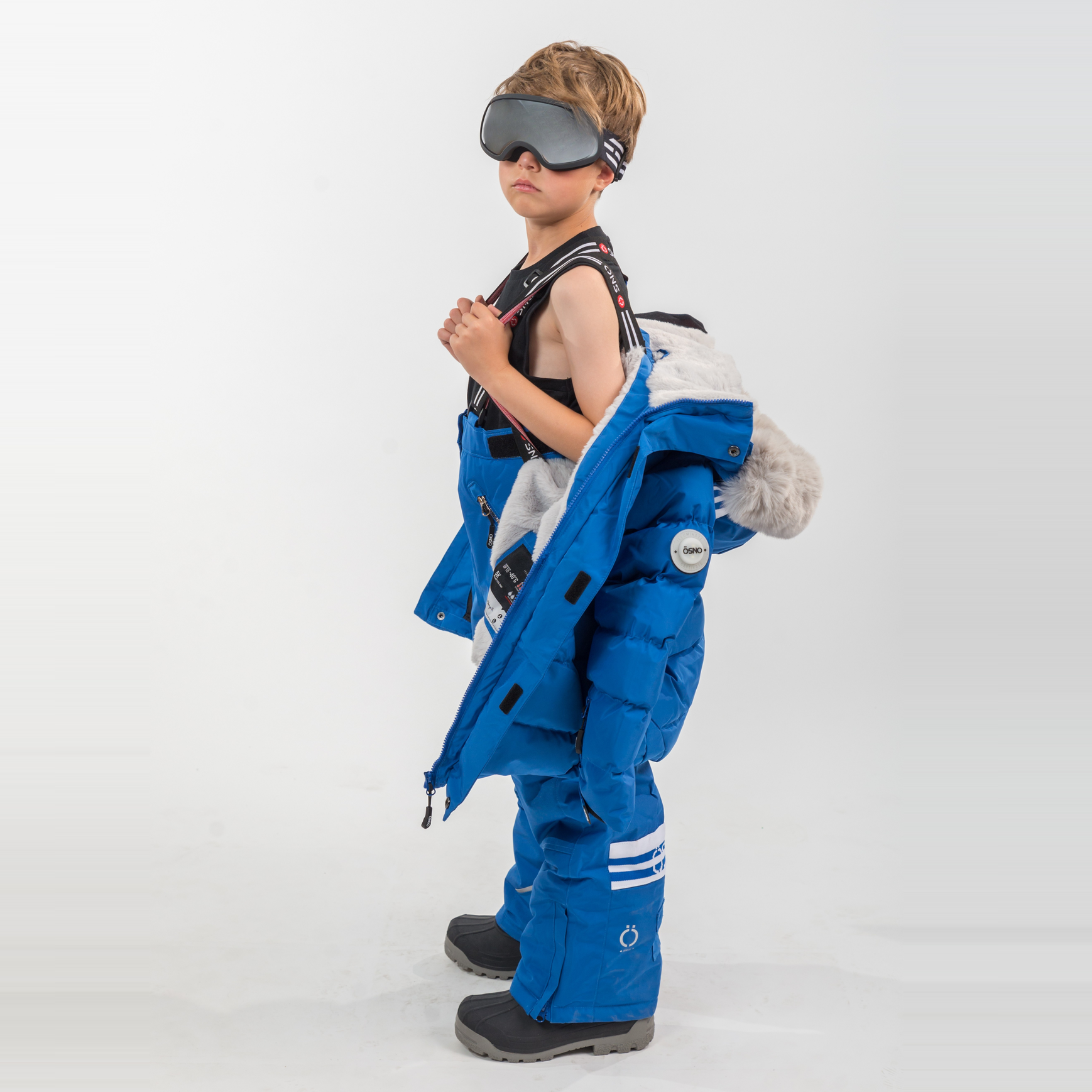 Featuring a huge removable light grey fur hood with OSNO’s new GripLock System for secure and easy attachment, plus a super-soft light grey full fur interior lining, this snowsuit is made for comfort and sophistication. Hidden extra-large side pockets keep essentials close without interrupting the sleek design. OSNO’s signature detachable LED patch completes the look with a modern edge—making it a great pick if you’re seeking a toddler boys' snowsuit that still looks refined.