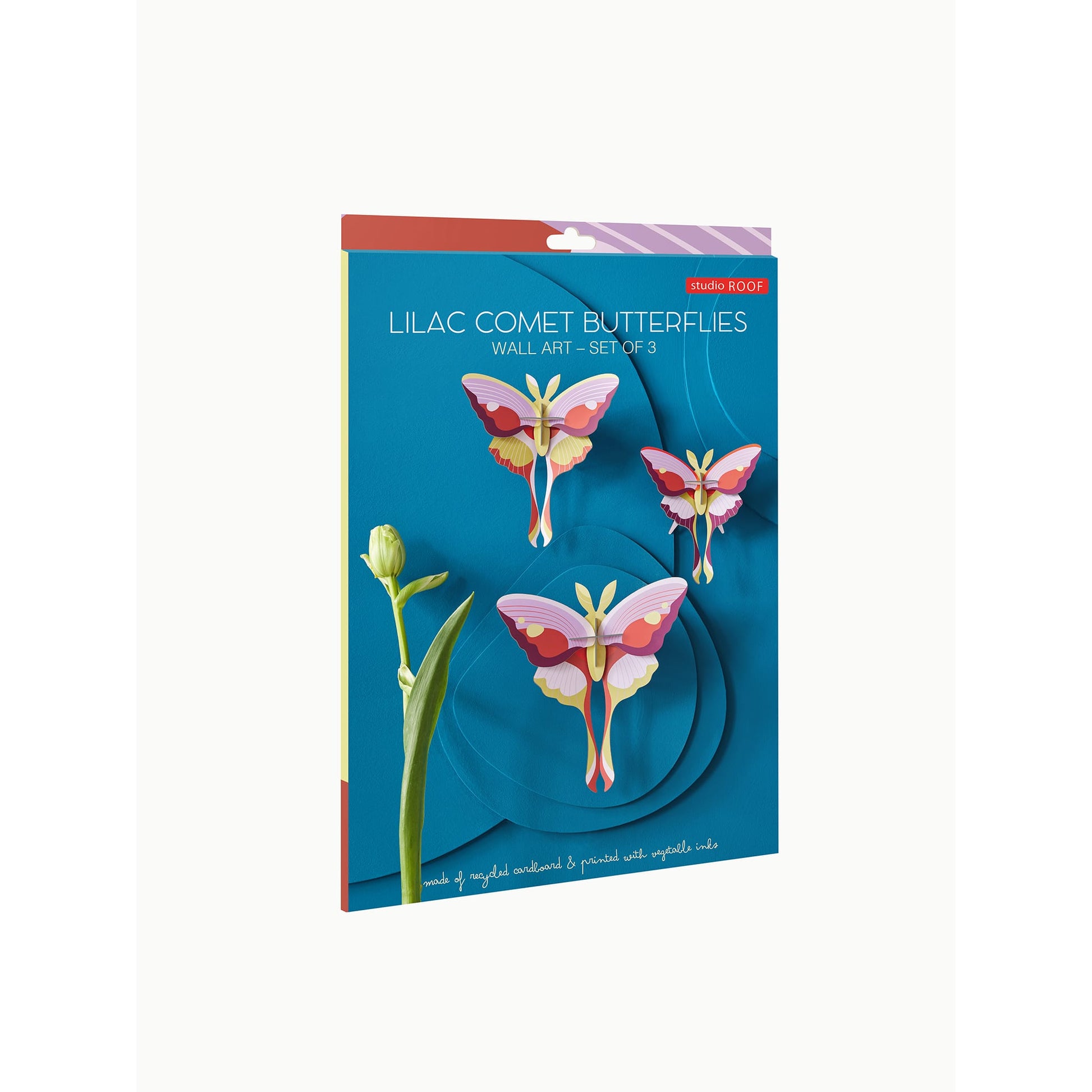 The Lilac Comet Butterflies set by Studio Roof brings the enchanting beauty of nature into your home with three colorful butterflies. These 3D objects, crafted from recycled cardboard and printed with vegetable inks, are easy to assemble and arrive flat-packed for convenience. Once built, the largest butterfly measures 19 x 8 x 20.5 cm (7.5" x 3.1" x 8"), making this set a stunning display of nature-inspired art.