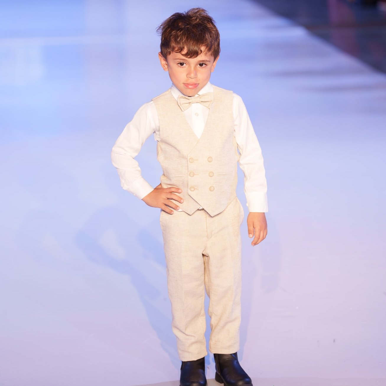 Elevate your formal style with Lucky Luke's boys’ vest set. This stylish linen boys’ vest set features a sleeveless vest, a soft off-white cotton shirt, slim-fit adjustable-waist knit cotton pants, and a matching bowtie. It's the perfect choice for any young superstar!