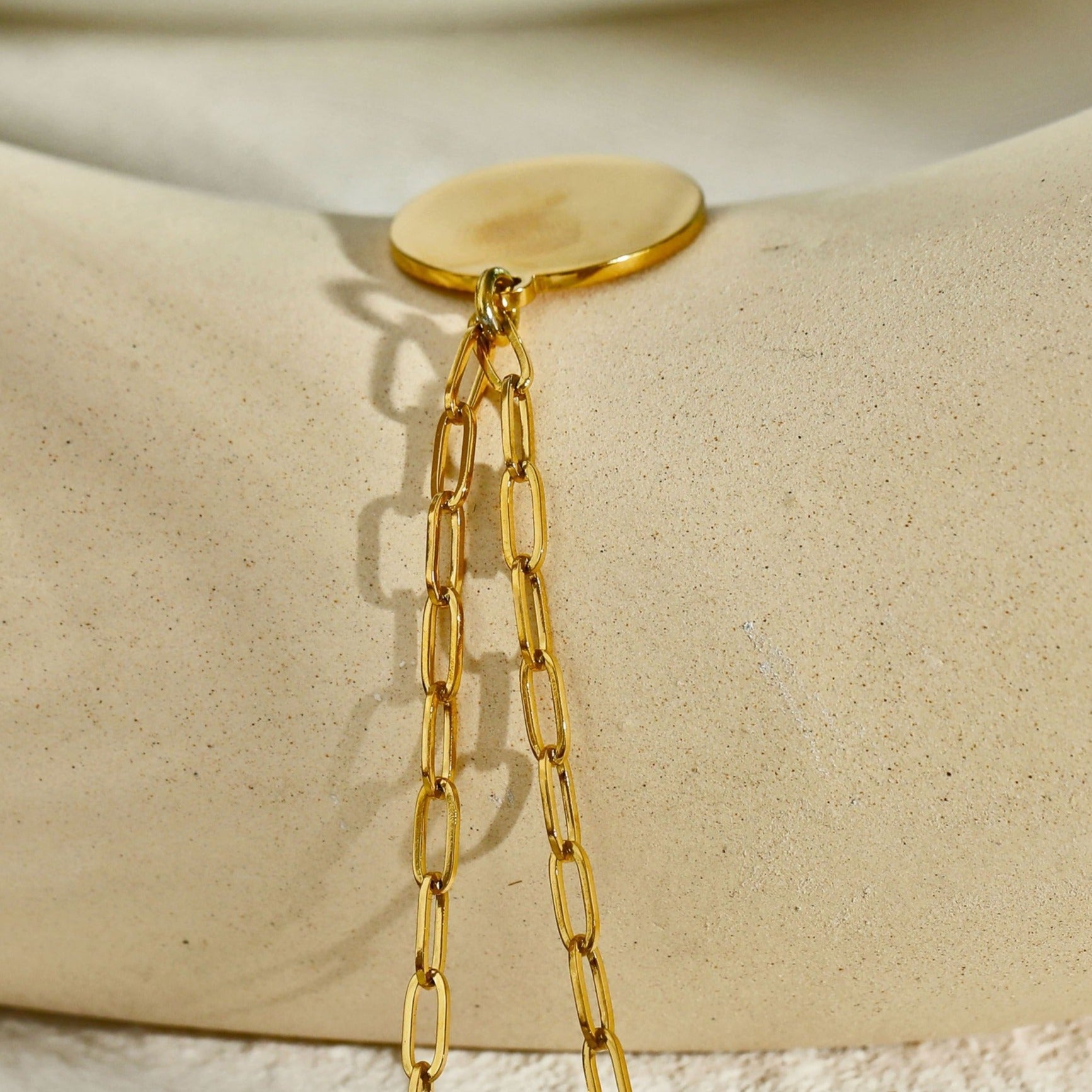 Featuring a linked chain with a white enameled star disc; striking the perfect balance between edgy and elegance.