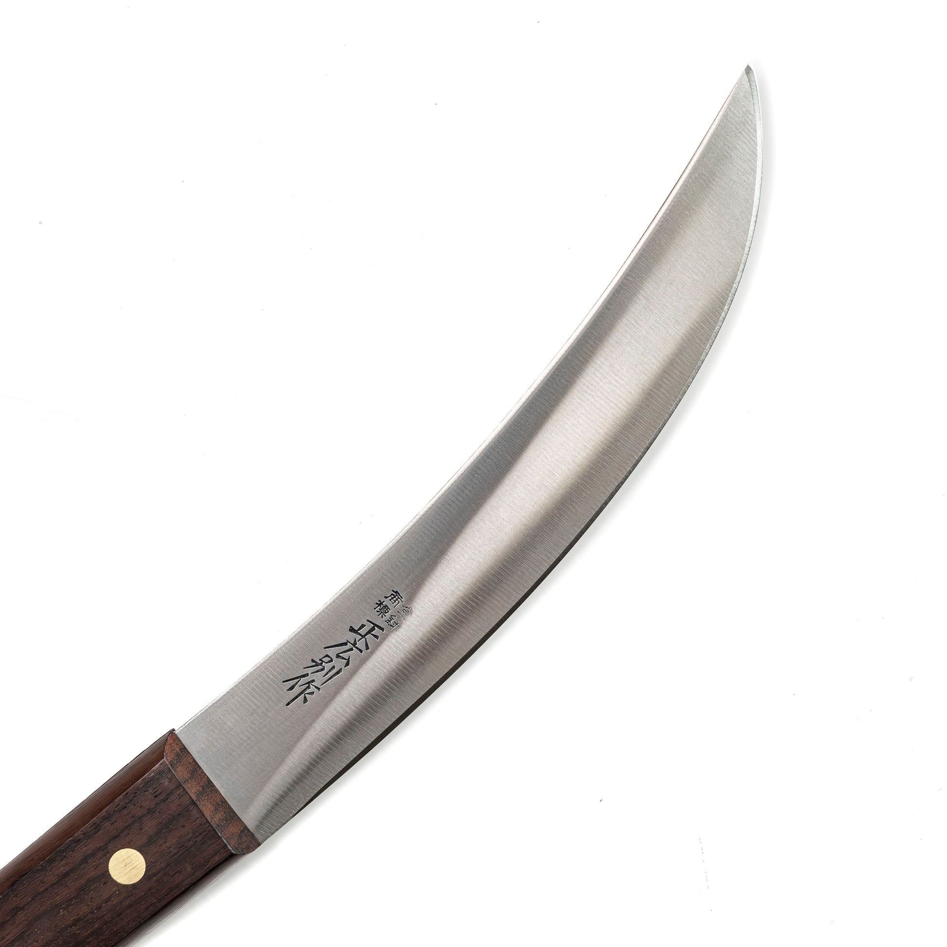 This boning knife from Masahiro are fairly stiff blades, designed to butcher carcasses, given their sweeping curve and length. You can use these guys in a reverse grip style, great for piercing through large sections of protein. The thick spine gives the knife a robust feel as it's not as thin as other Japanese knives, making it slightly less prone to chipping. This knife is not meant to go through bones and will likely chip if used to try to cut bones.
