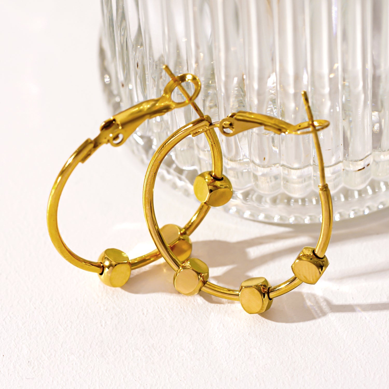 At the heart of these earrings lies a sleek round hoop, symbolizing timeless sophistication. Anchored to this classic hoop are three striking square beads, each exuding a contemporary charm that demands attention. The geometric design of the beads adds a bold, architectural dimension to the earrings, making them a standout piece in any jewelry collection.