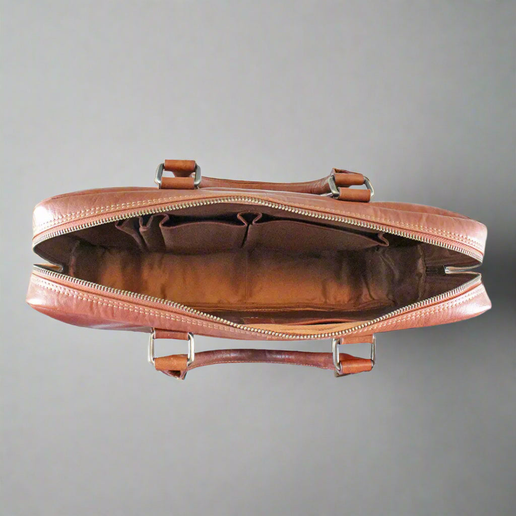 - Interior has a laptop pocket + a large zip pocket, 2 open pockets & 2 pen slots