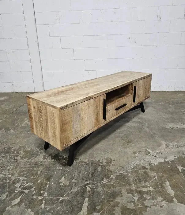 Meuble télé en bois de manguier brut sur patte en acier noir