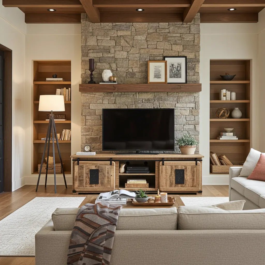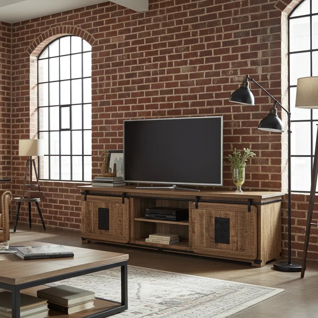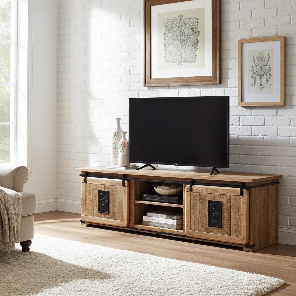 Meuble Télé Farmhouse en bois de manguier brut portes coulissantes