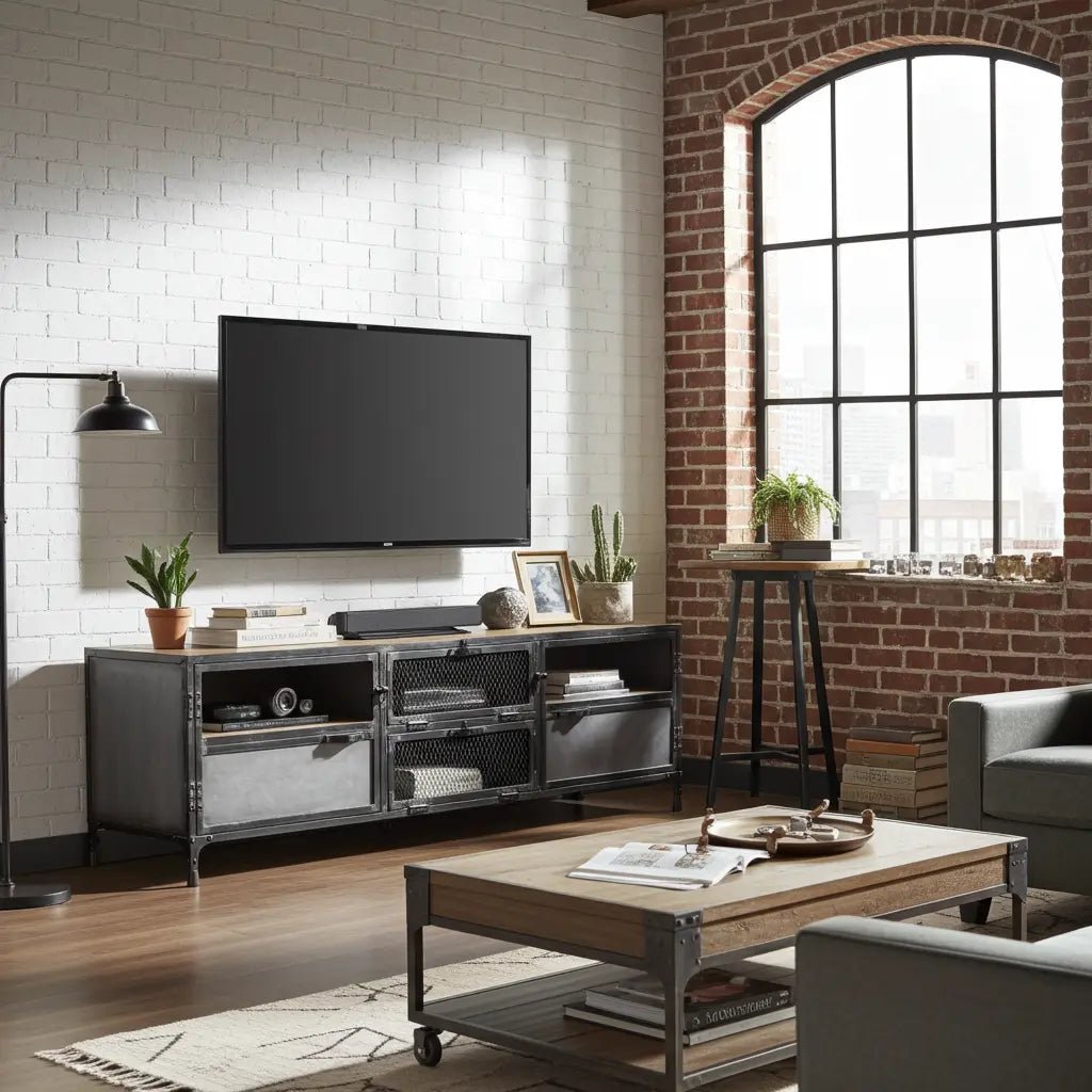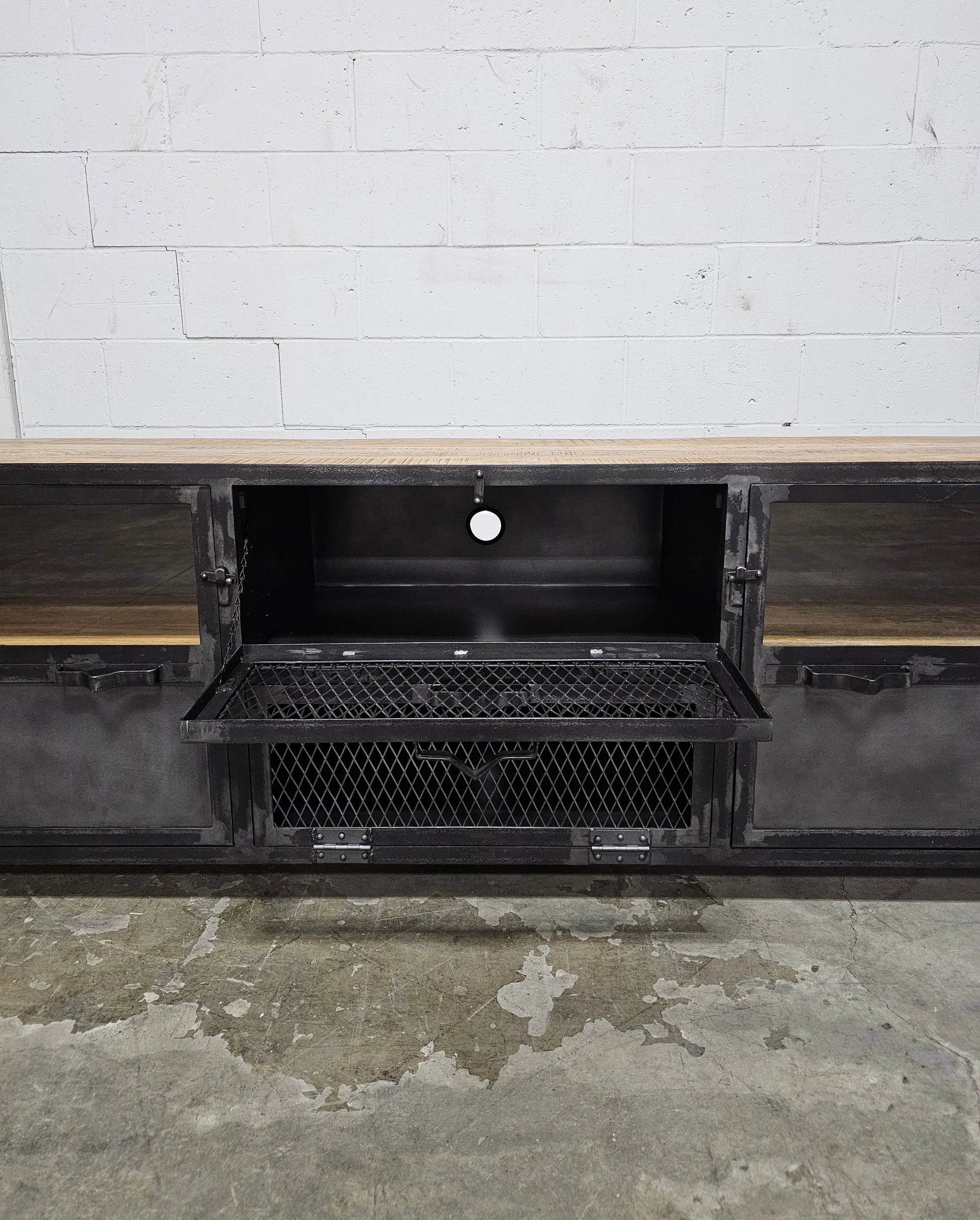 Contrastes de matières : L'encadrement en acier brut souligne les lignes du meuble et lui confère une allure structurée et résolument contemporaine.