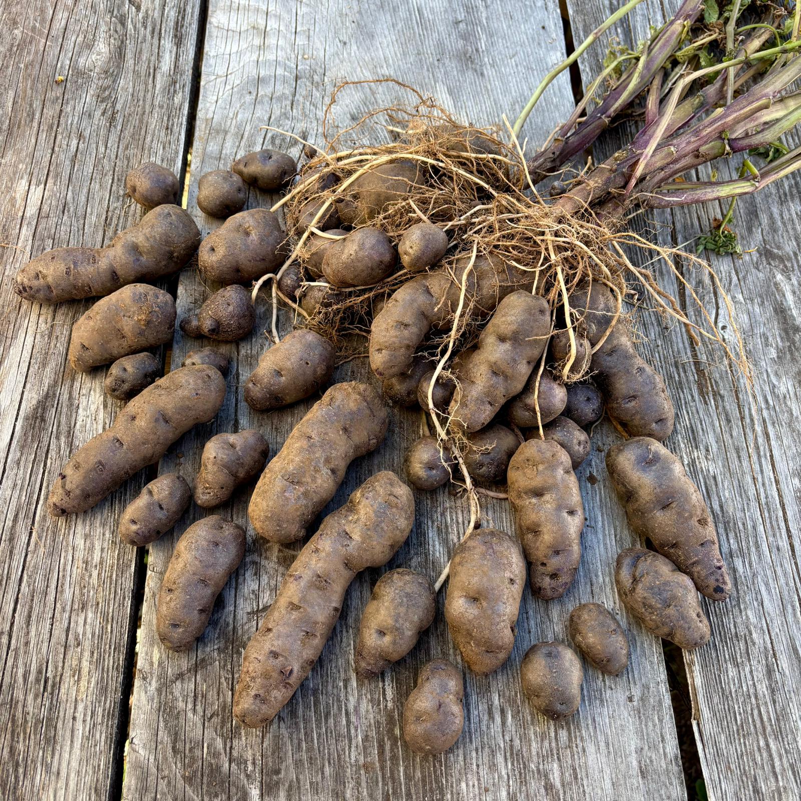 Grow these potatoes and enjoy a constellation of dark purple/black skins and interiors of speckled white/purple to pure solid purple.