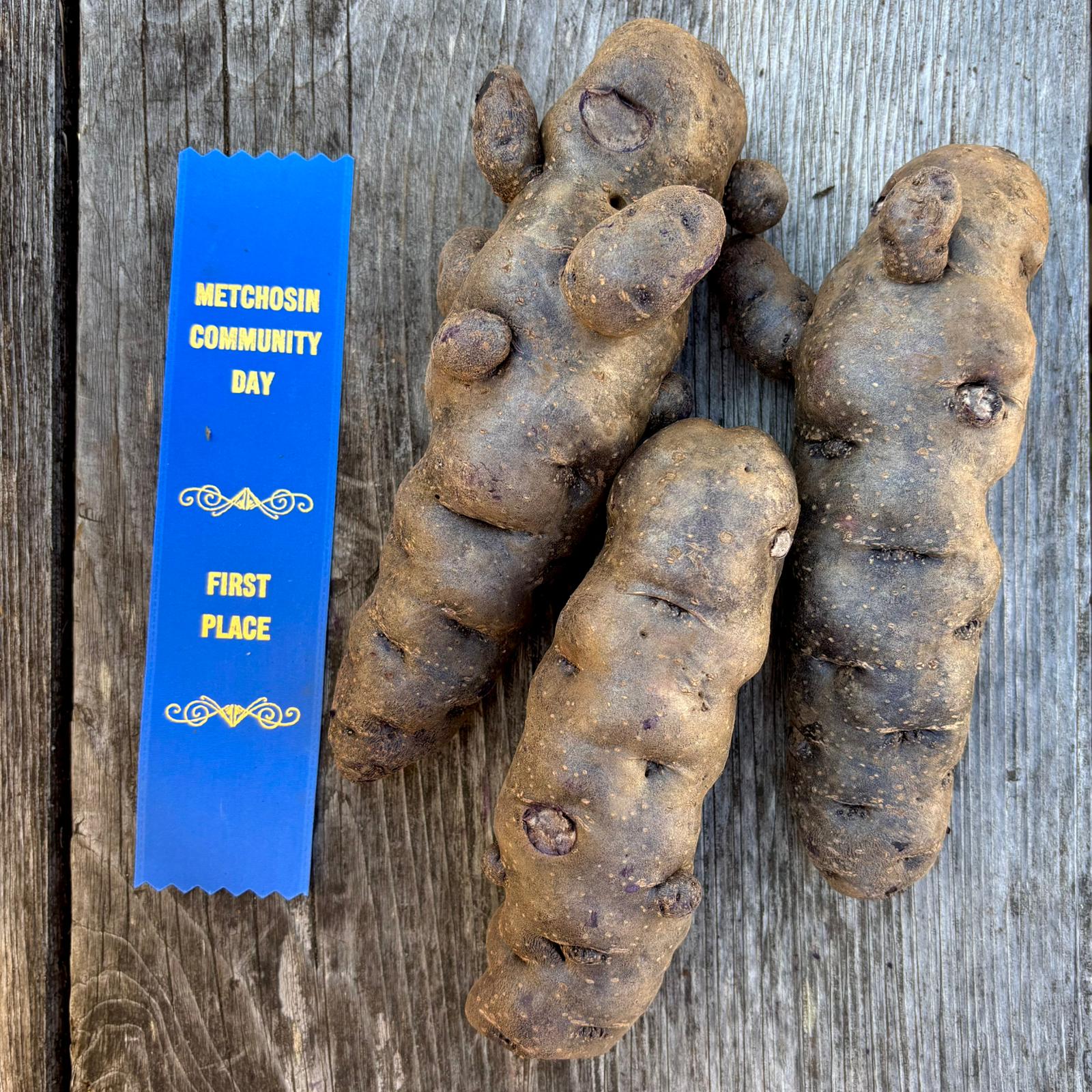Midnight Mix is the result of an accidental cross between the 1794 Haida Ozette and Metchosin Farm’s own My-Chosen Purple potatoes. While we initially tried separating the new offspring into different varieties we found it impossible to be certain without cutting each tuber open. After 2 years of growing out these new crosses, the deep purple/white tubers just kept getting more diverse and interesting, and at 6 different types identified and counting we finally gave up and named them all.